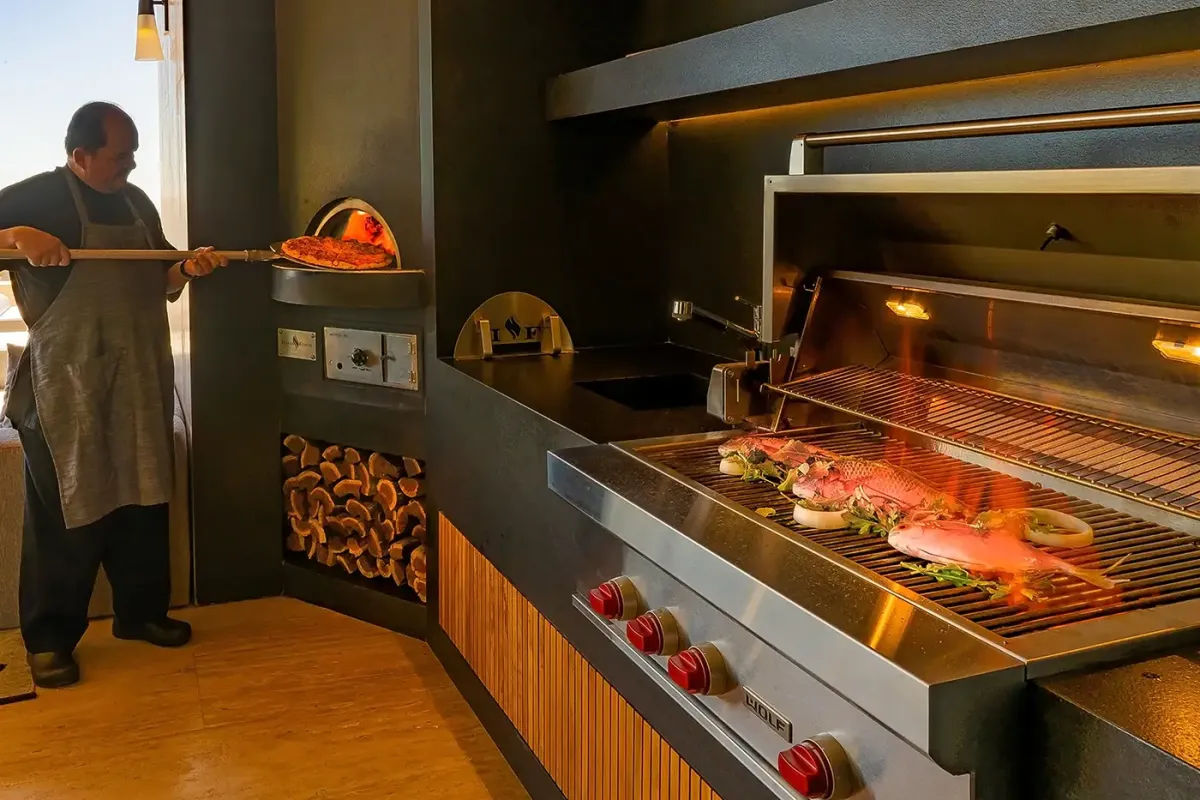 The villa features two exceptional ocean-view terraces. The main level offers covered and open lounge areas, a sleek pool and jacuzzi, outdoor pizza oven, teppanyaki grill, and a sun deck overlooking the sea. The lower terrace reveals a relaxed social space with a bar, lounge seating, and an infinity pool with dedicated sunbathing areas.
