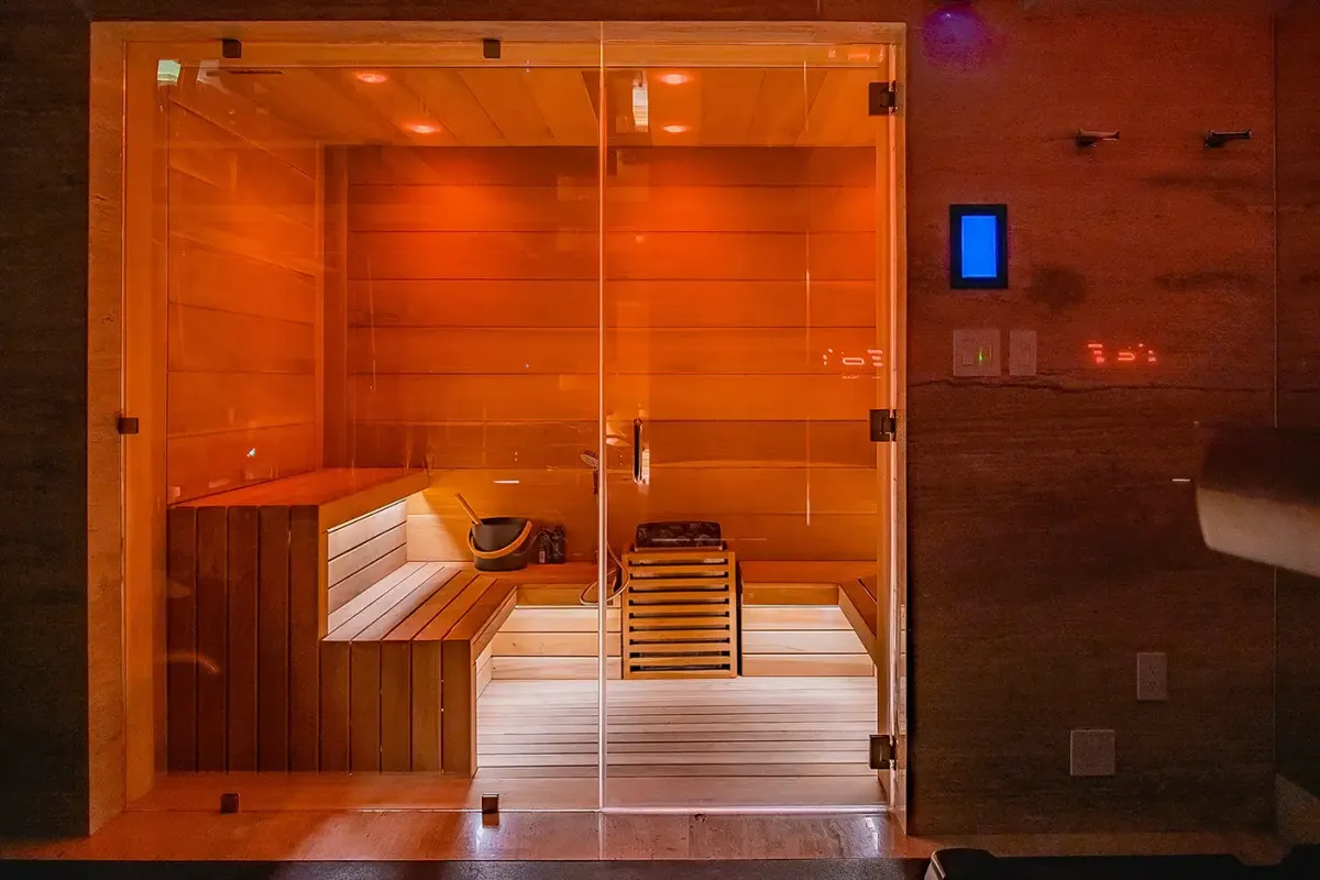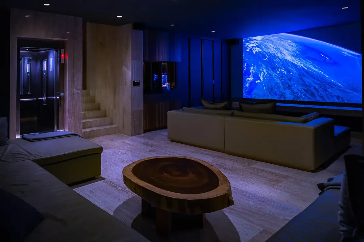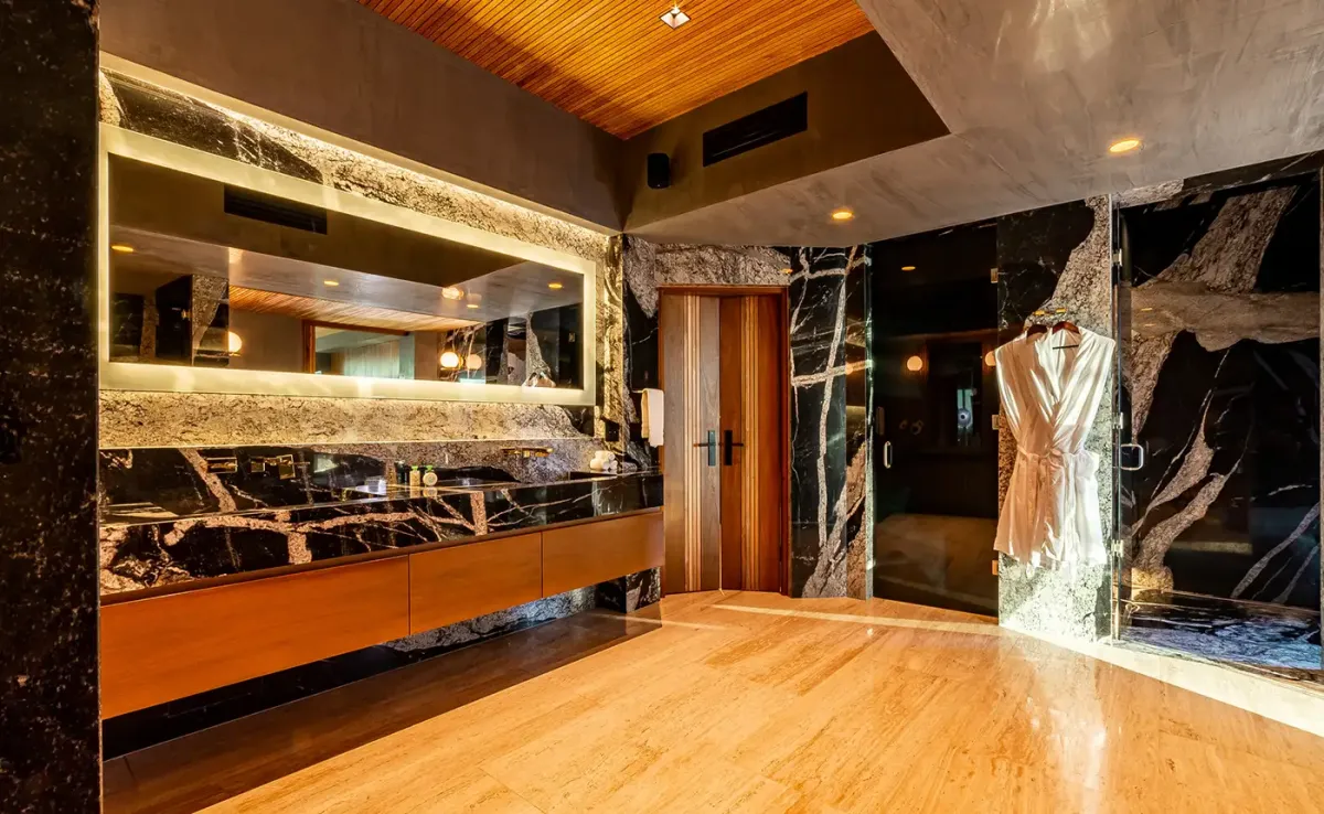 Inside, the home delivers world-class amenities, including a wine cellar, gourmet kitchen with separate butler’s kitchen, fitness room, sauna, and private home theater. The bedroom suites are designed as serene sanctuaries, combining comfort with elegant design.