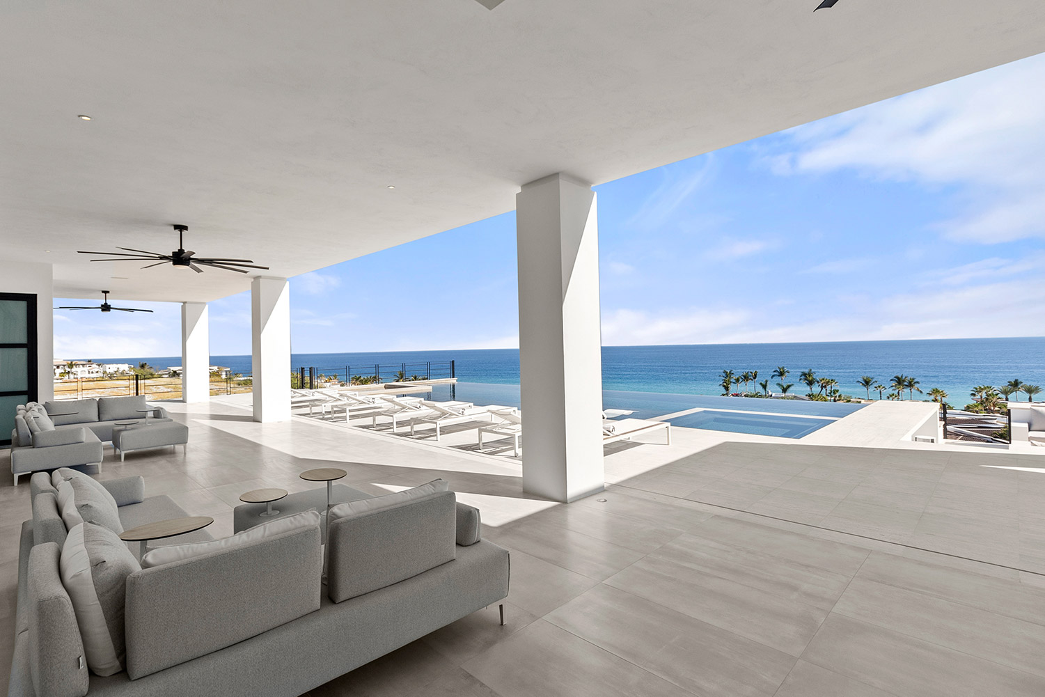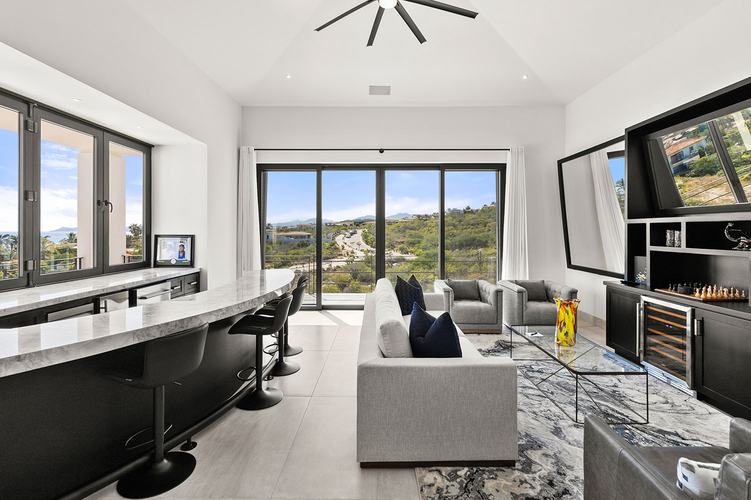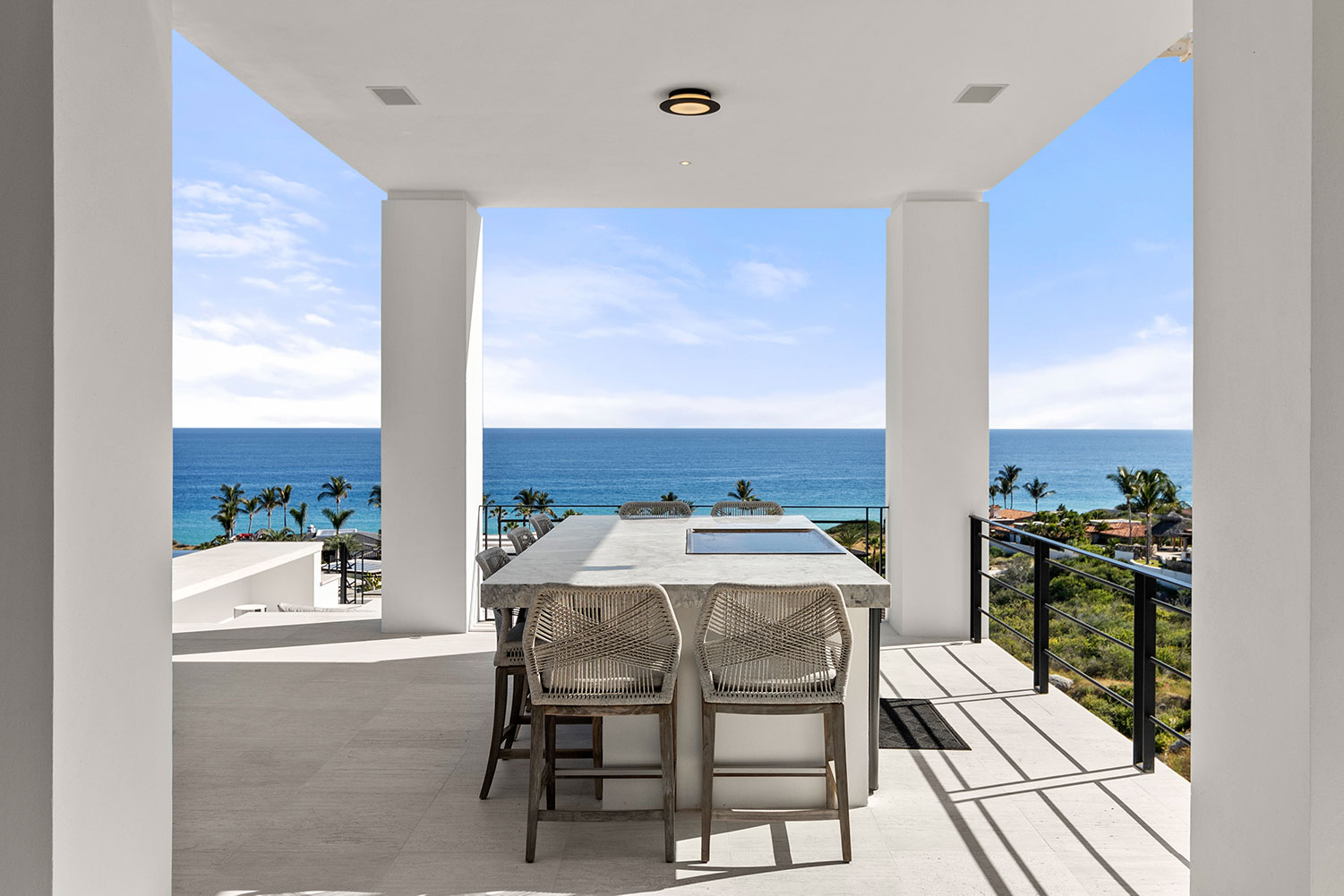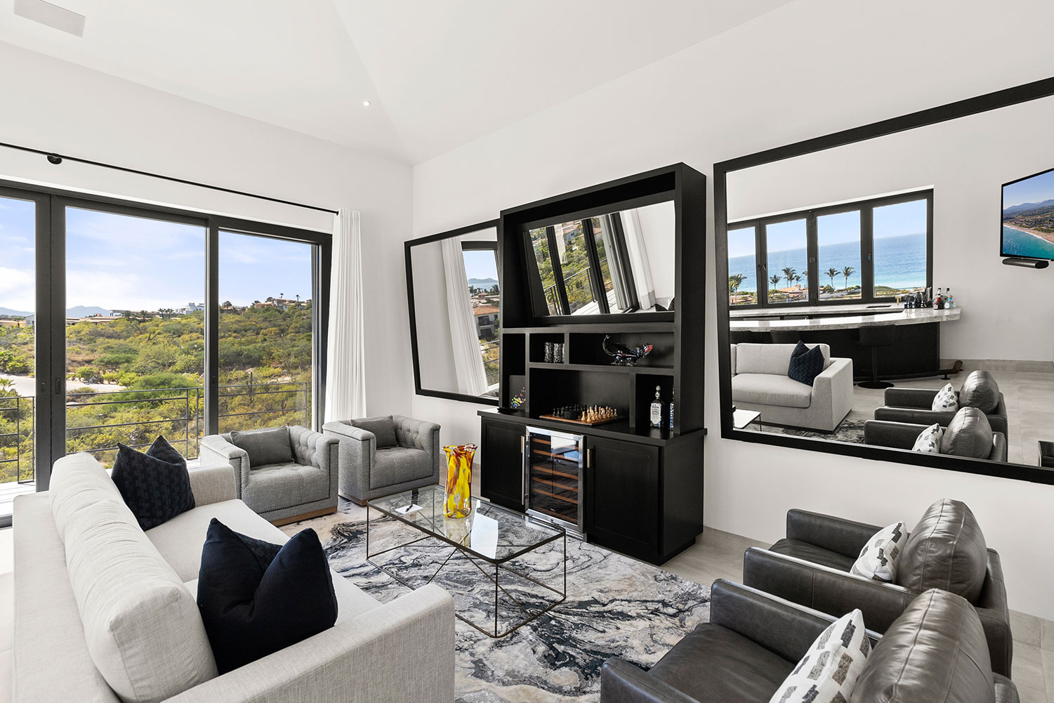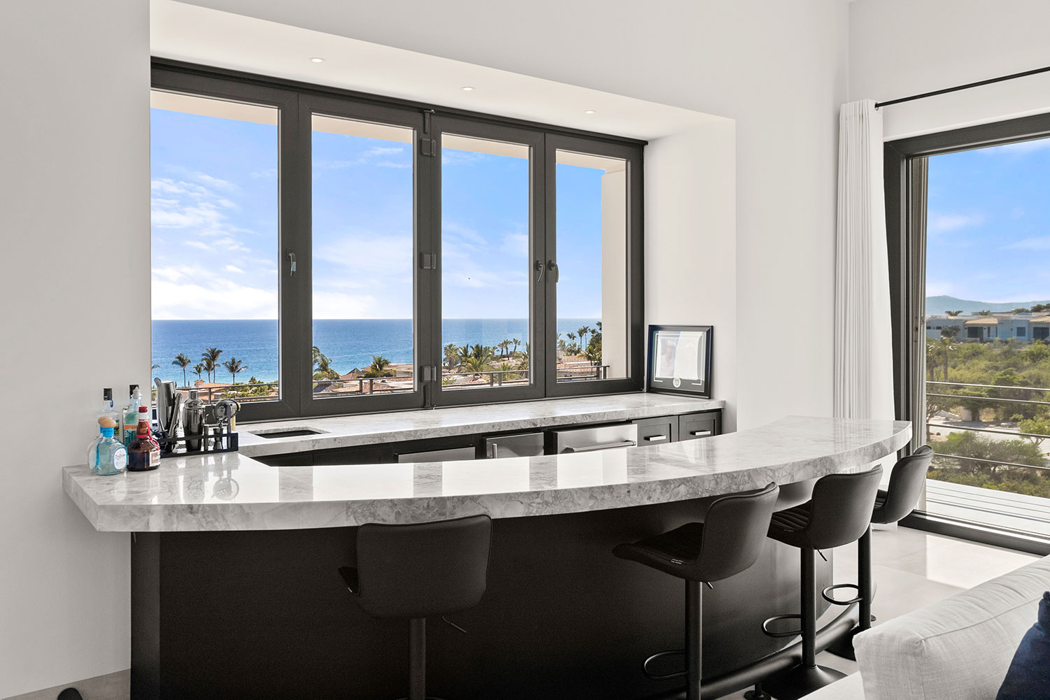 Poco Paraiso is a two-level villa in Puerto Los Cabos where glass, scale and indoor-outdoor living frame the Sea of Cortez at every turn. The main level opens into a chef-driven kitchen, bar lounge, theater room and game areas, while a gym with sauna and a cold plunge set the tone for guests who travel with wellness in mind. Pocket doors disappear to connect everything to the terrace: an infinity pool, jacuzzi, cold tub, tepanyaki station and fire pit lounge designed for long Baja evenings. Daily housekeeping and a personal concierge orchestrate the stay, with Puerto Los Cabos Beach an easy three-minute walk away.