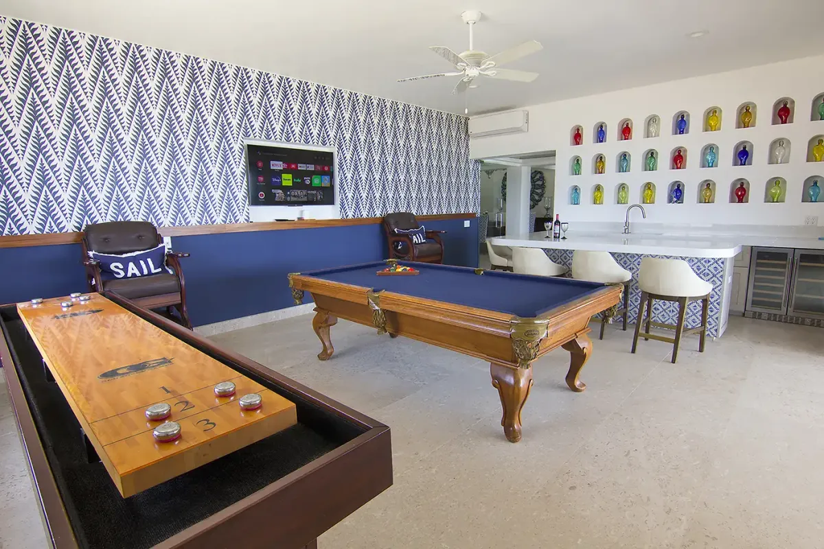 Each bedroom suite is spacious and stylish, accented with curated artwork and contemporary details. Outdoor living takes center stage with sweeping ocean views, a pool with swim-up bar, inviting fire pit, and an upstairs terrace with wet bar—perfect for relaxed gatherings. Inside, enjoy a gourmet kitchen and a pool table for added entertainment.