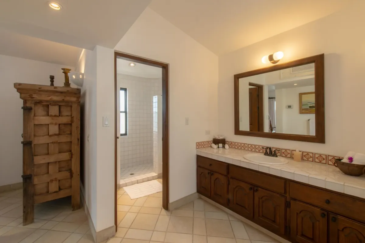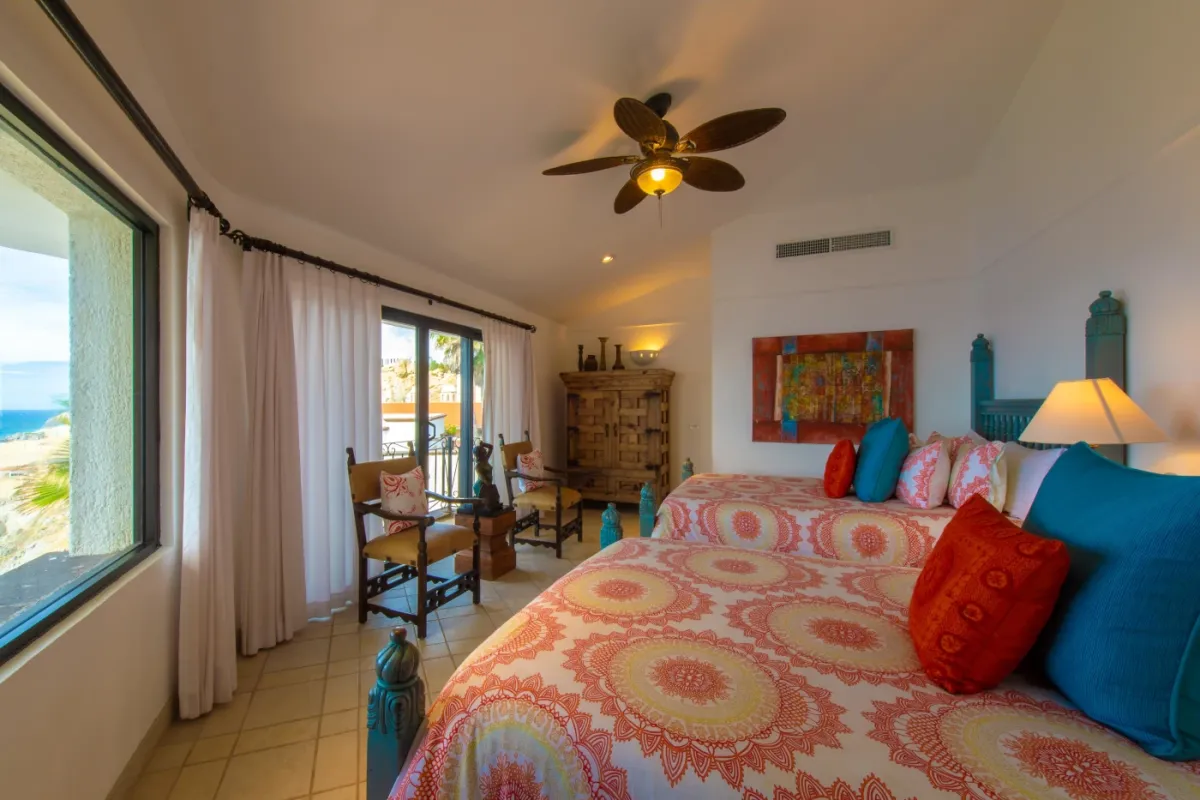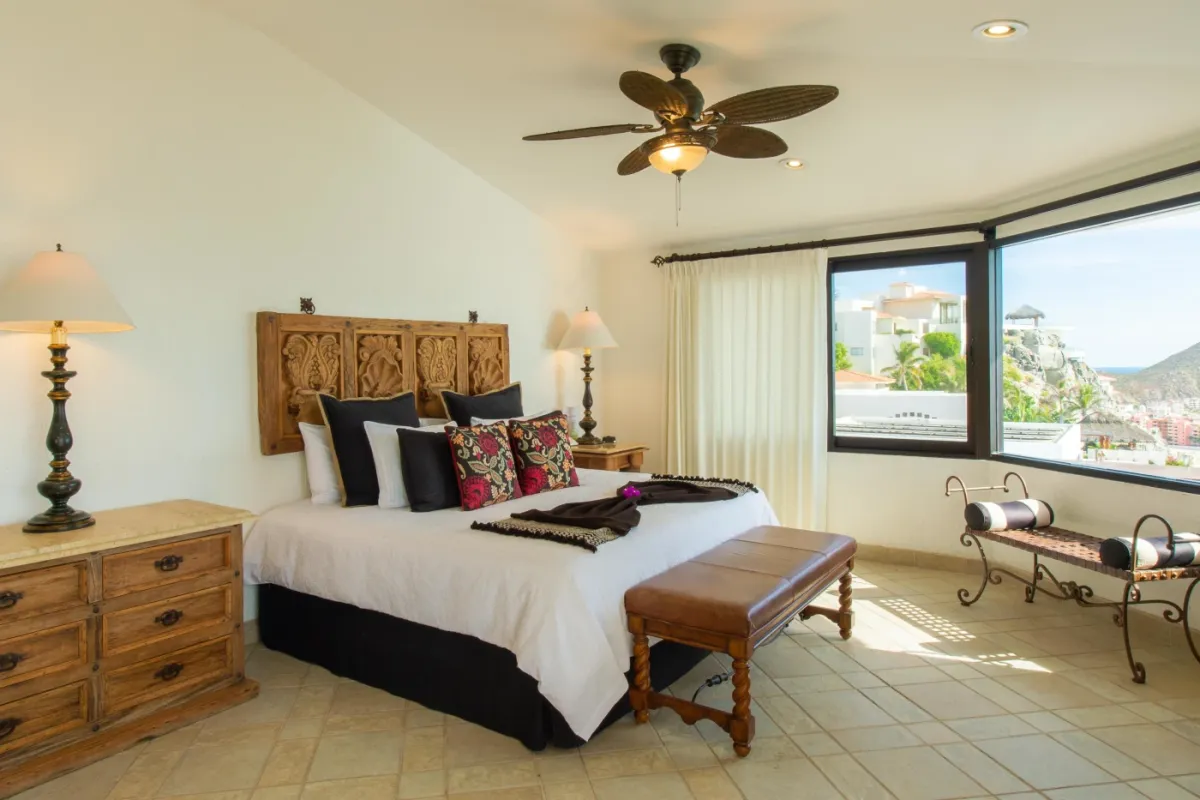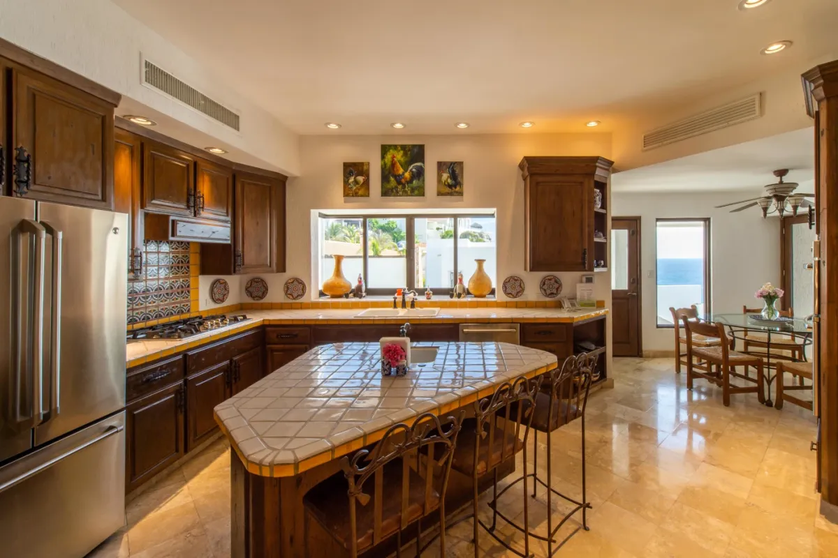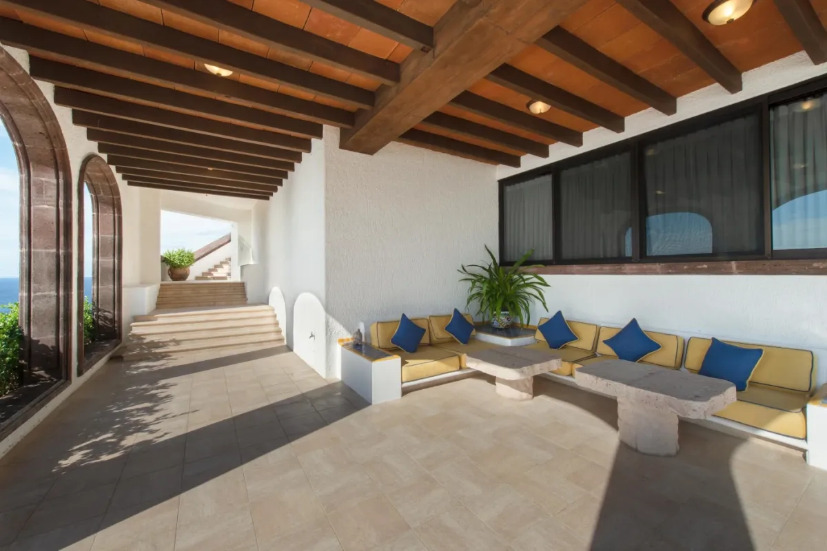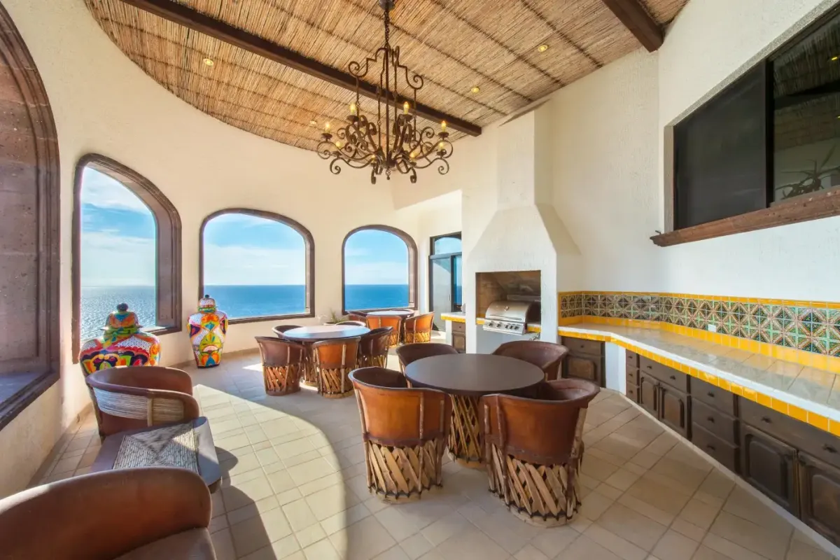 The villa enjoys sweeping views of both the Pacific Ocean and the Sea of Cortez, best appreciated from its expansive outdoor areas. The main patio is ideal for dining and lounging, while the swimming pool and jacuzzi sit on a sun-filled terrace with ample seating. A cozy patio off the kitchen provides the perfect spot to take in Cabo’s unforgettable sunsets.