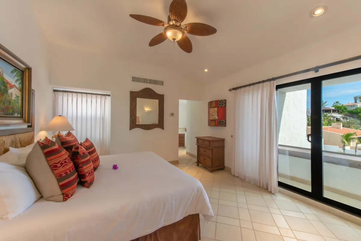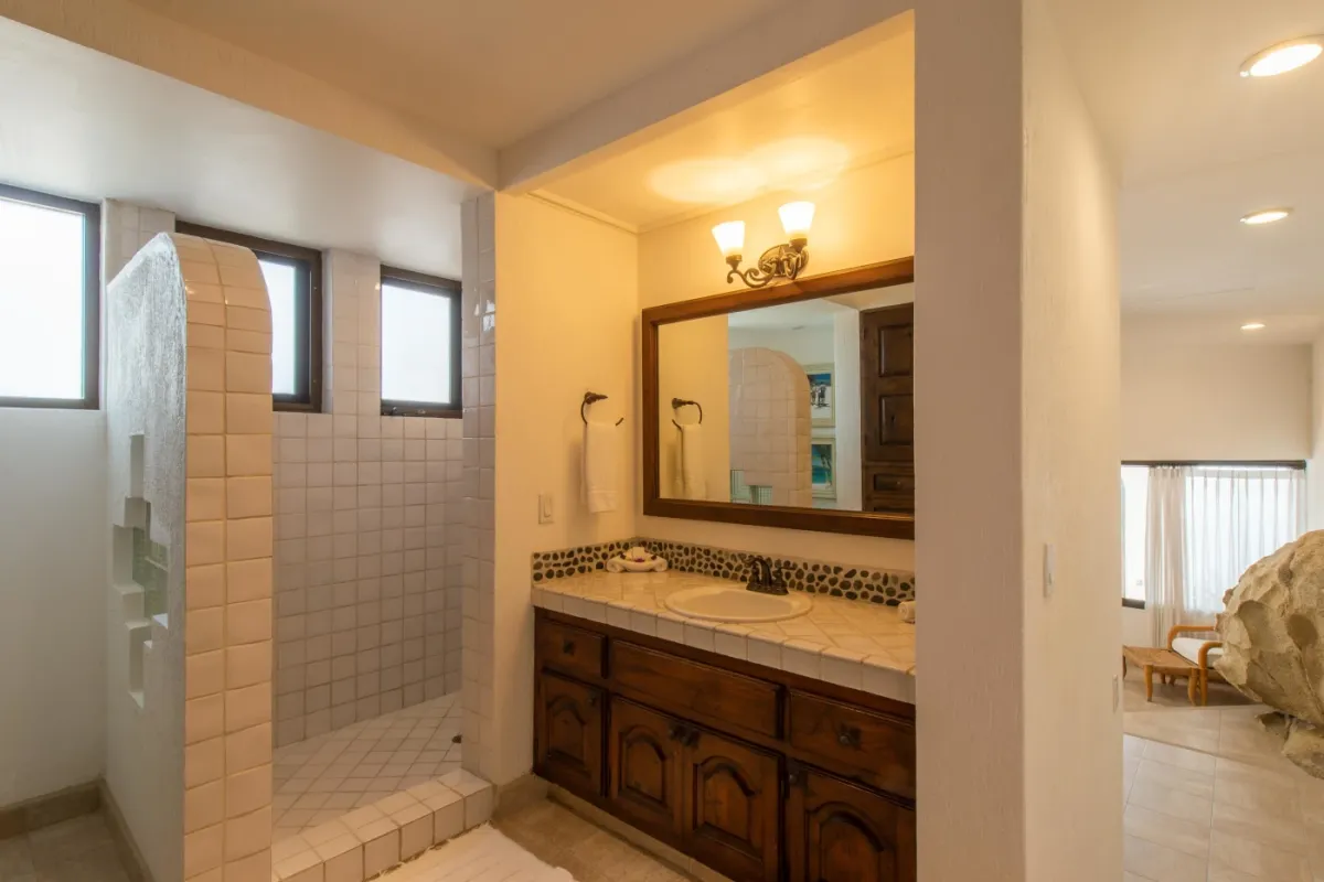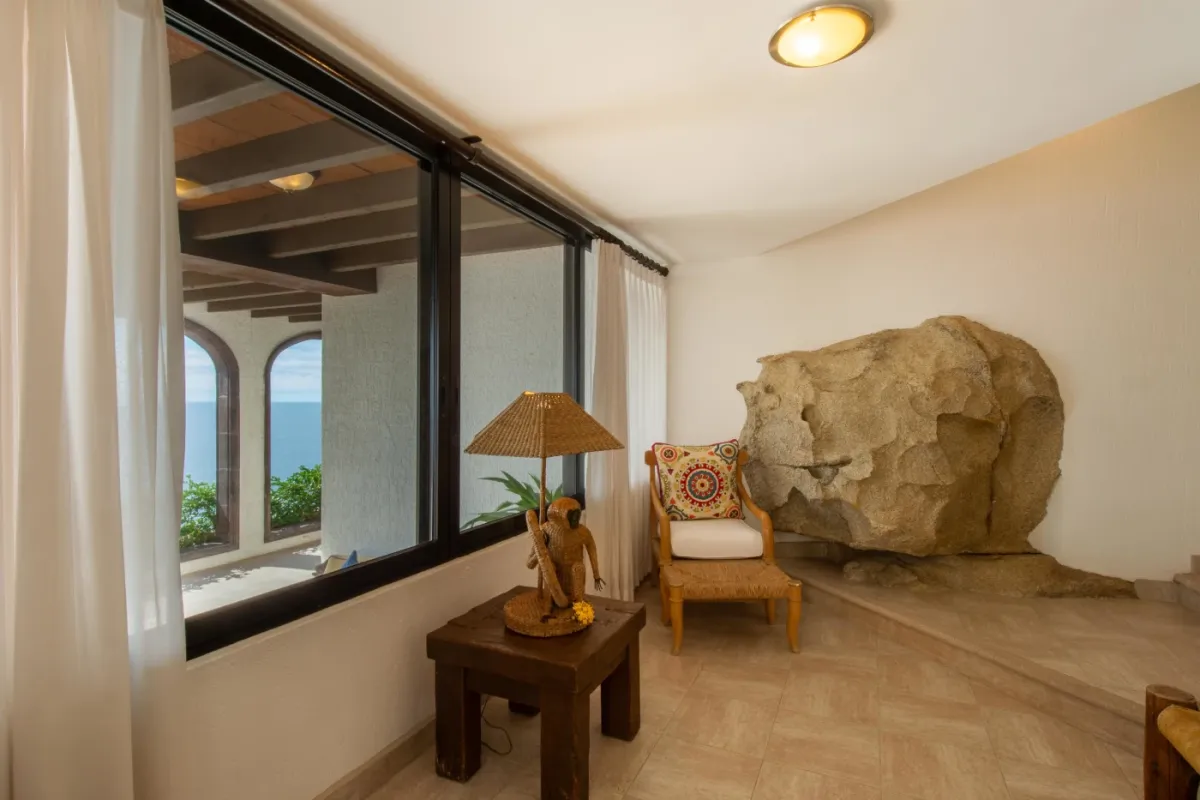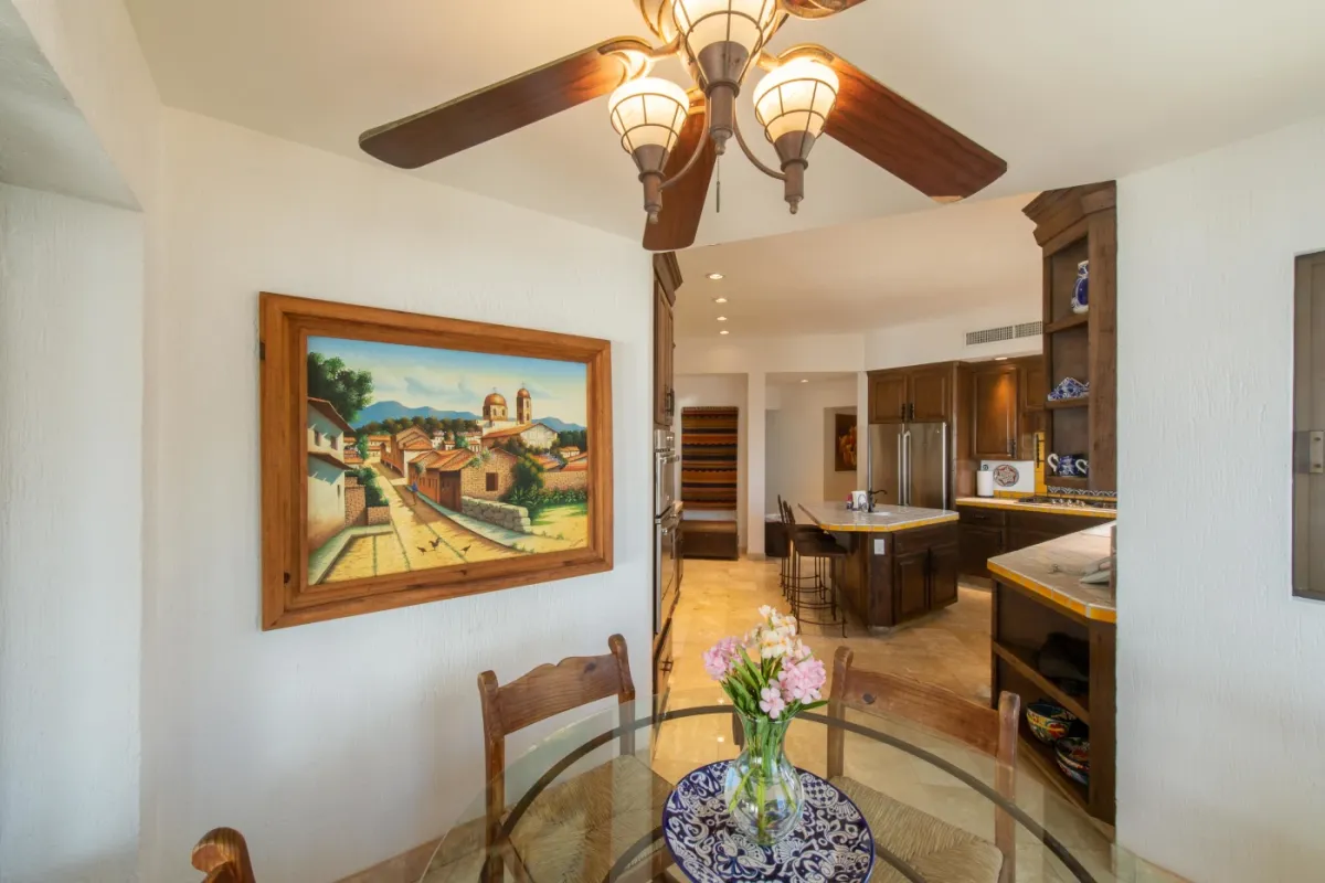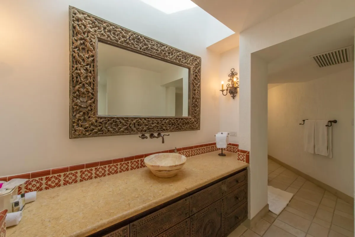 The villa enjoys sweeping views of both the Pacific Ocean and the Sea of Cortez, best appreciated from its expansive outdoor areas. The main patio is ideal for dining and lounging, while the swimming pool and jacuzzi sit on a sun-filled terrace with ample seating. A cozy patio off the kitchen provides the perfect spot to take in Cabo’s unforgettable sunsets.