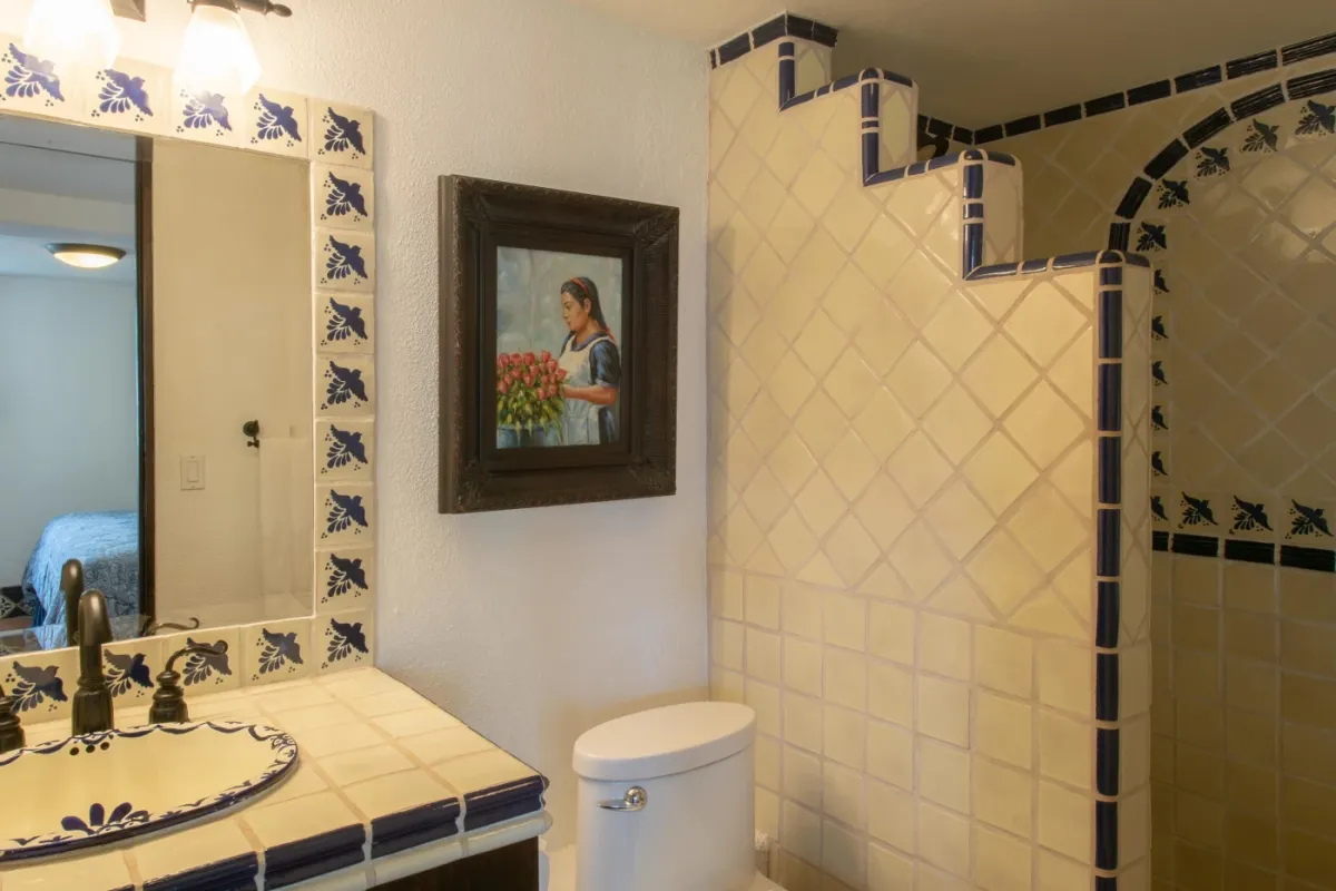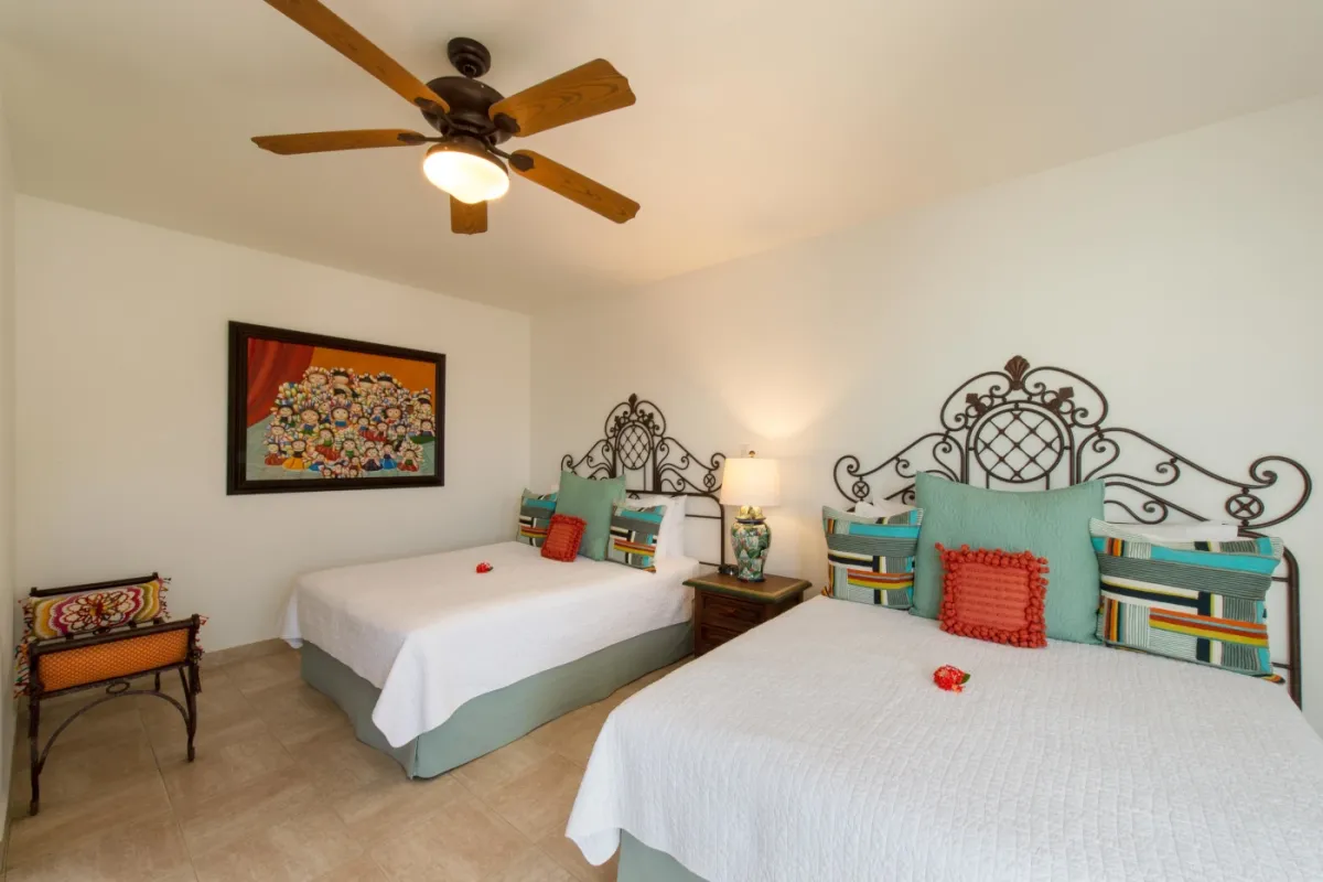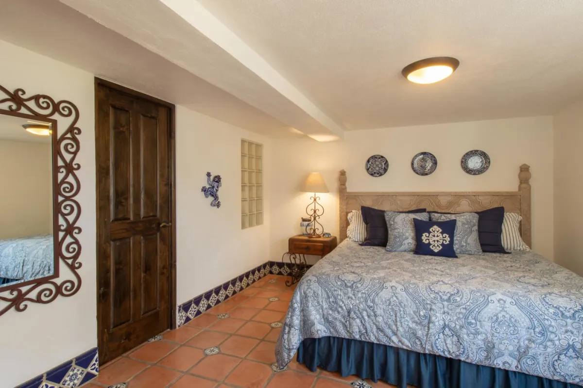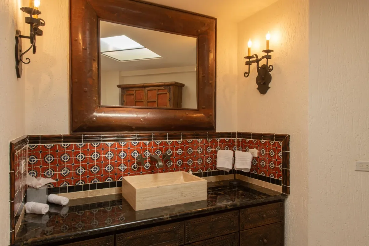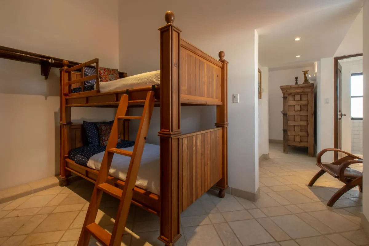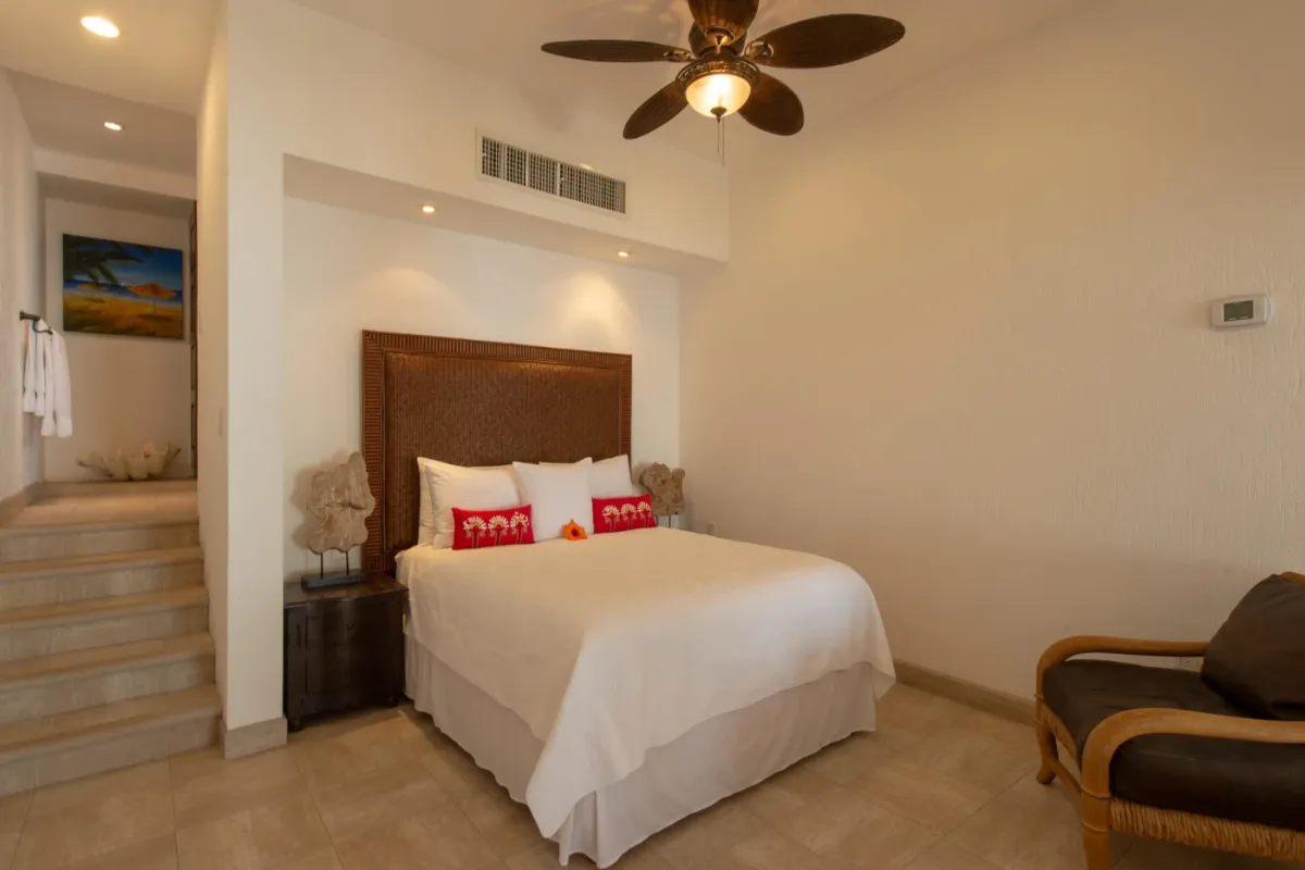 The villa enjoys sweeping views of both the Pacific Ocean and the Sea of Cortez, best appreciated from its expansive outdoor areas. The main patio is ideal for dining and lounging, while the swimming pool and jacuzzi sit on a sun-filled terrace with ample seating. A cozy patio off the kitchen provides the perfect spot to take in Cabo’s unforgettable sunsets.