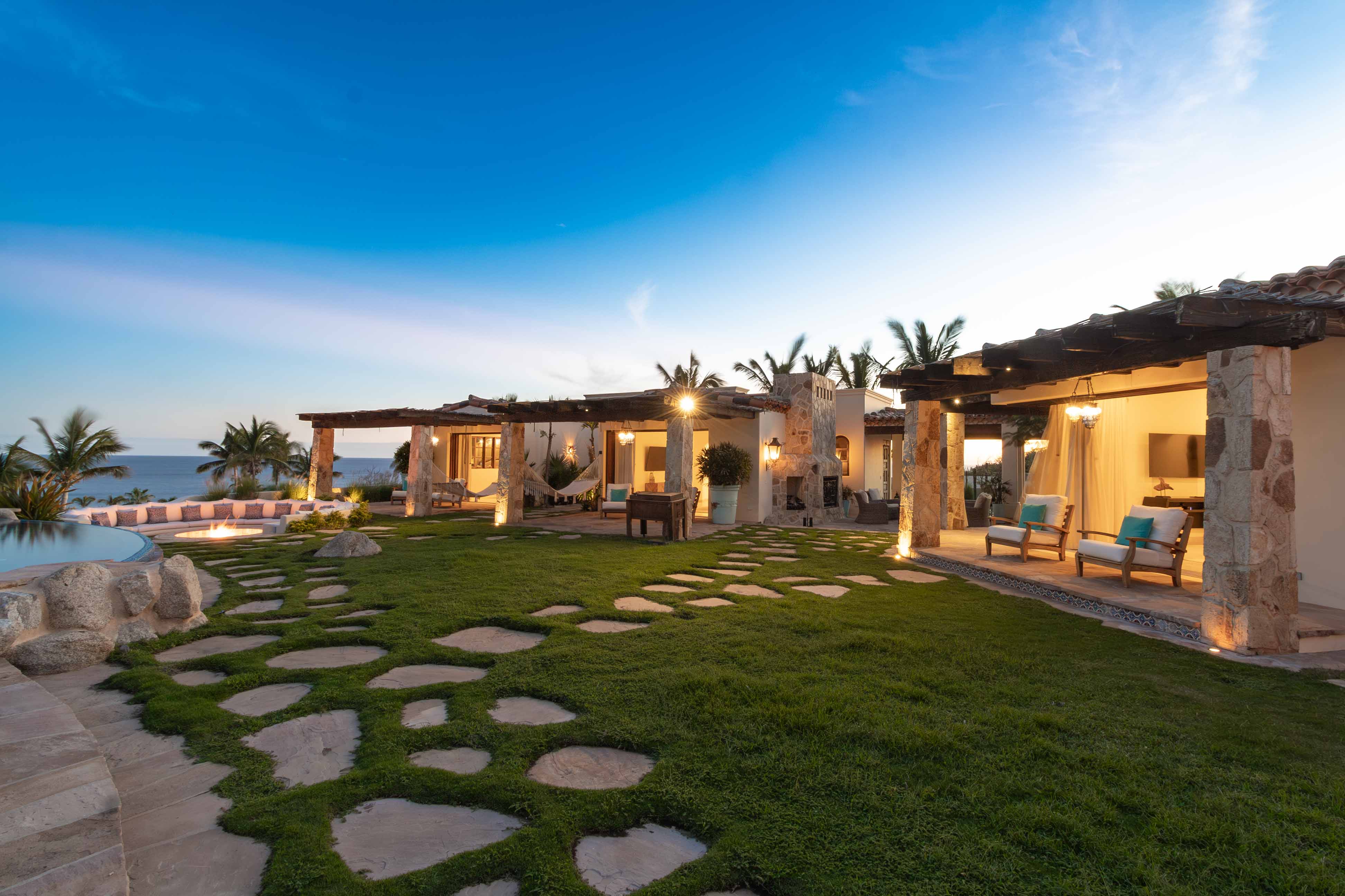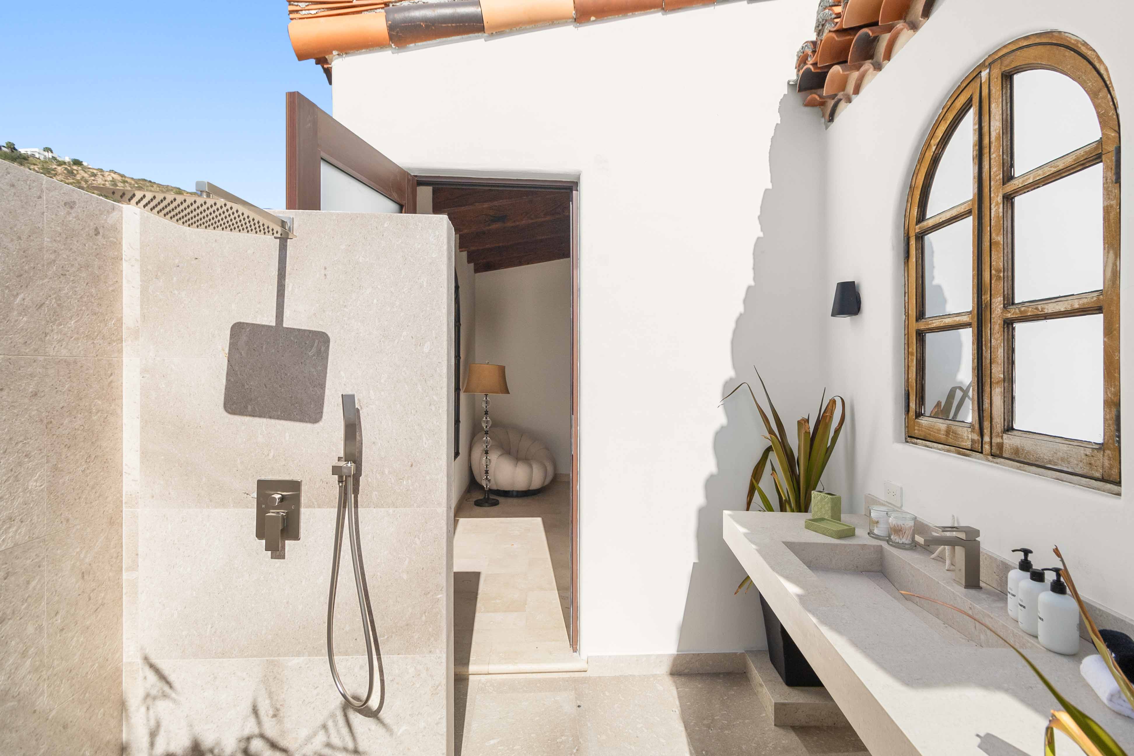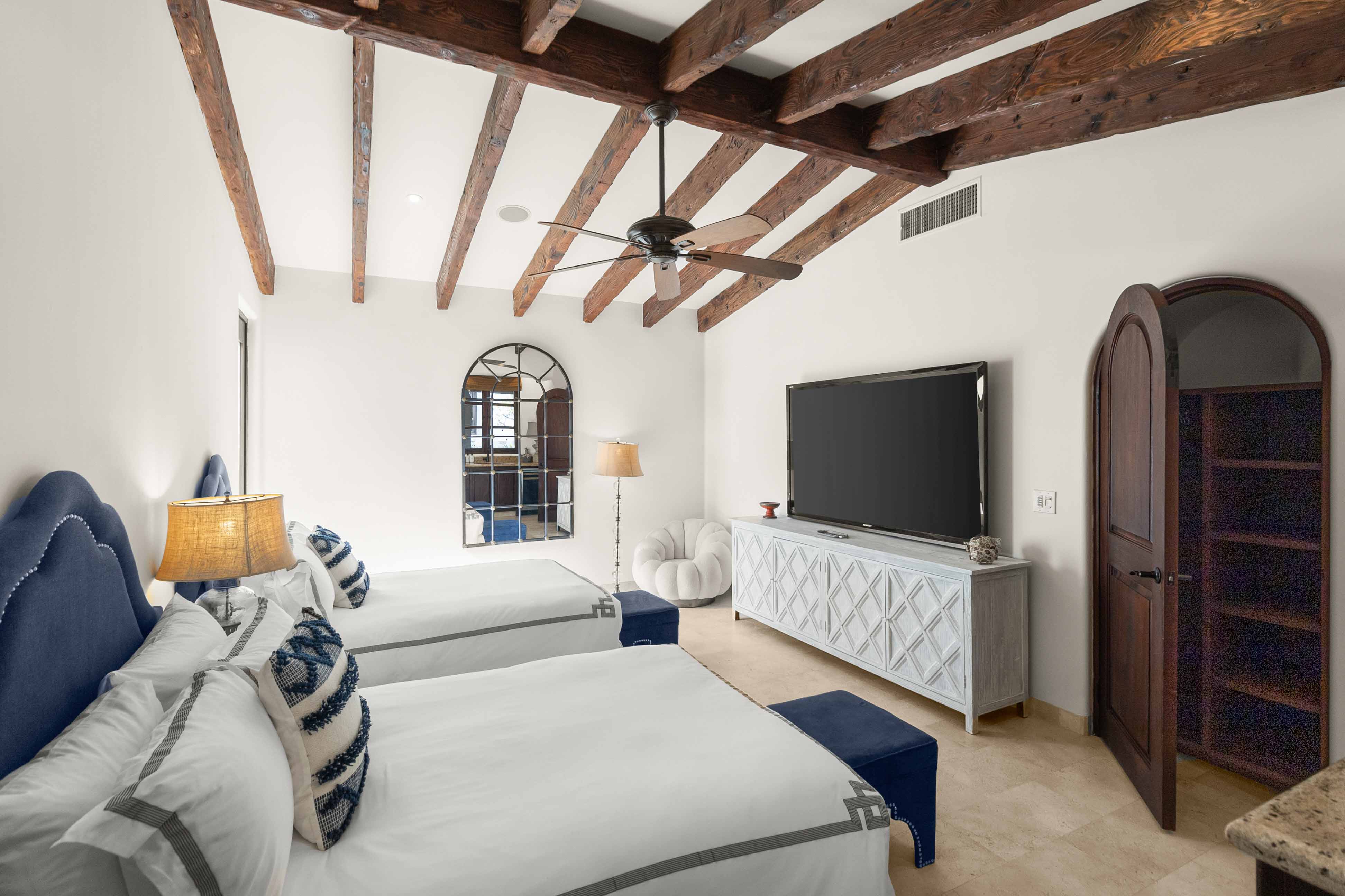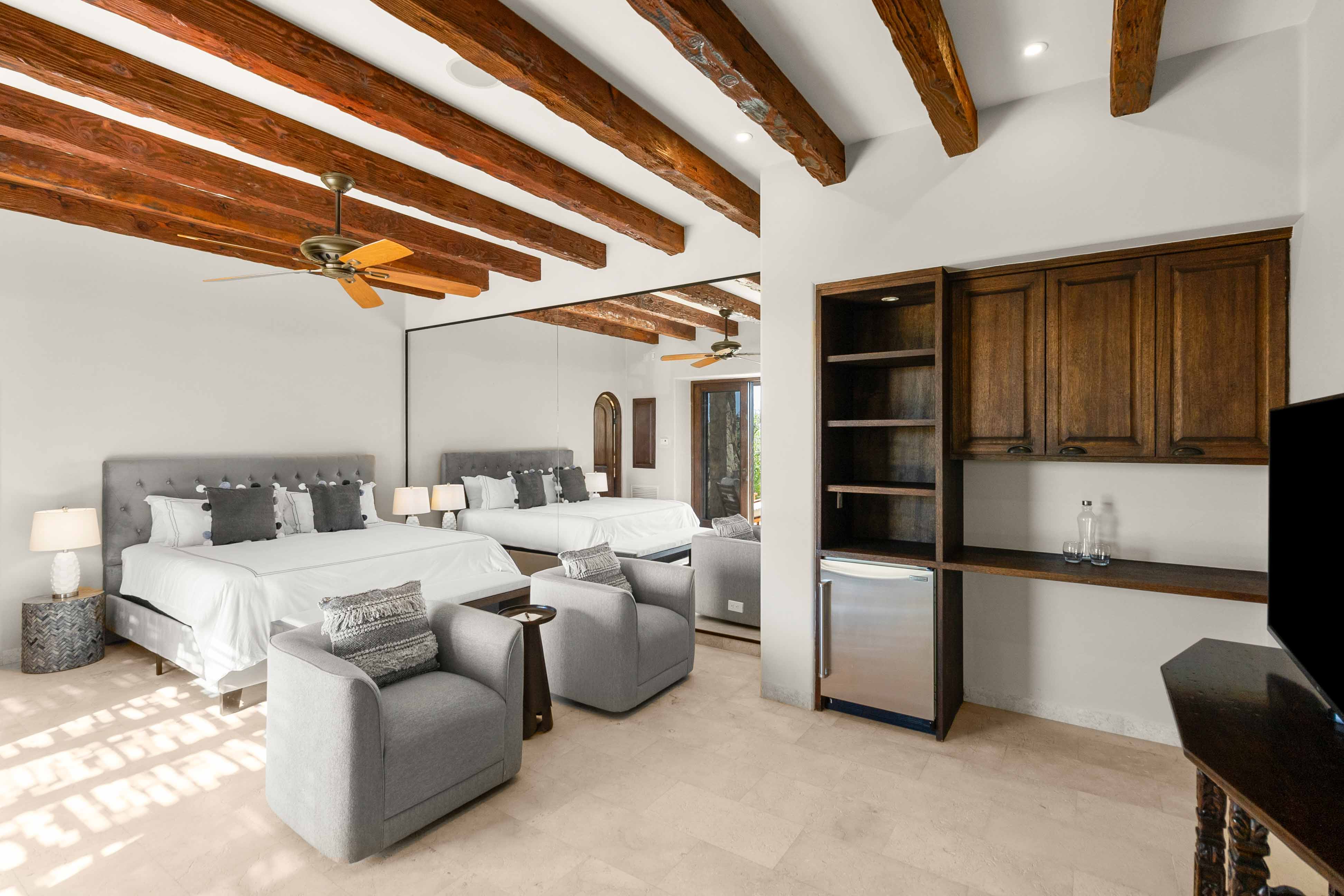 Set across four hillside lots inside a prestigious, elevated community in Cabo San Lucas known as “The Beverly Hills of Cabo,” Casa de Karma commands cinematic Pacific views with the quiet of Pedregal’s cobblestone streets and old-world charm — yet sits just minutes from downtown. Contemporary Mediterranean design brings vaulted ceilings, stone textures, and warm neutrals together in a single-level layout that opens wide to the ocean air. A chef-inspired kitchen anchors the interior, supported by a butler kitchen and full staff for those who prefer not to lift a finger while in Cabo. Outside, a custom infinity pool with swim-up bar, covered terraces, bocce, and dual ocean-view fire pits turn the terrace into the home’s social stage. Daily service by a private culinary team, butlers, housekeeping, and a dedicated concierge frames the entire experience.
