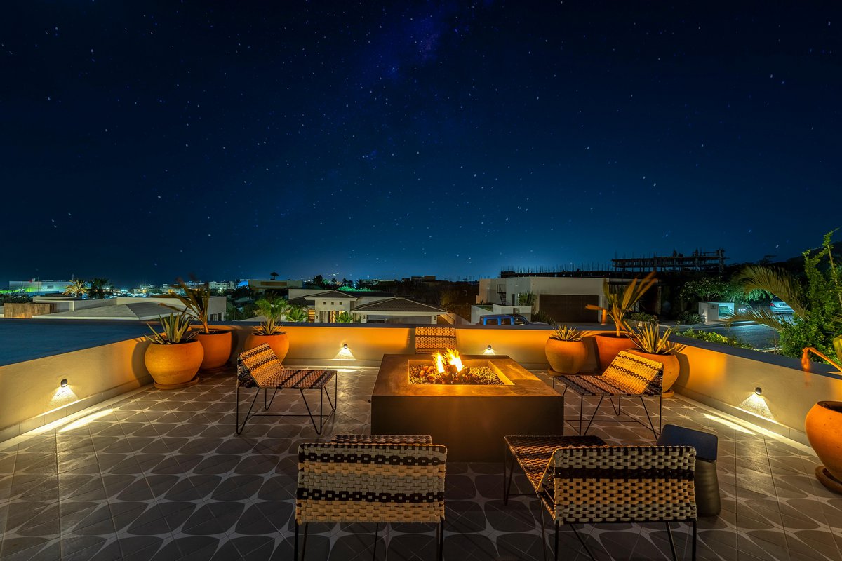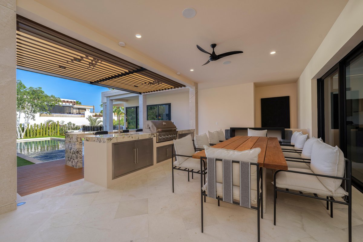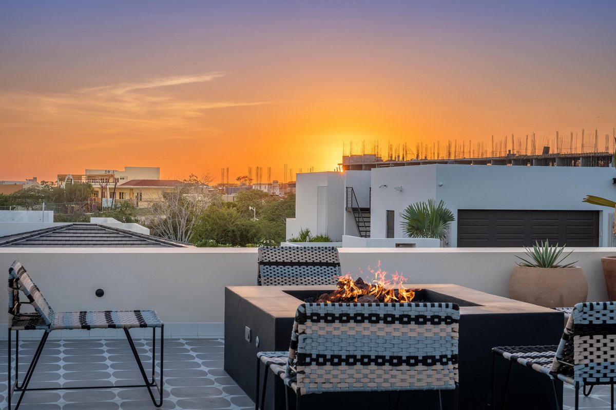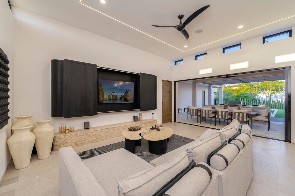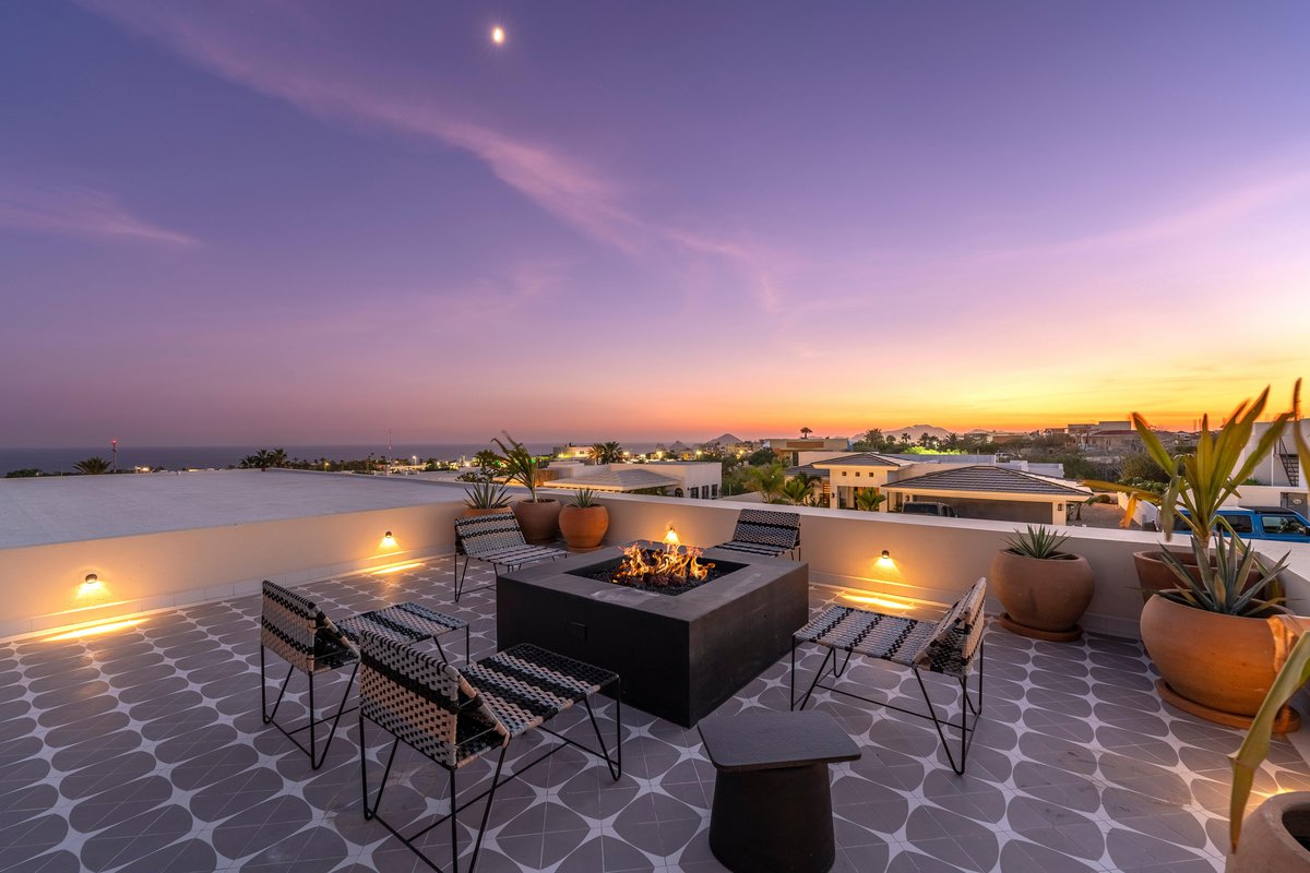 Perched in the gated community of Cresta del Mar, this villa was designed for slow mornings, golden sunsets, and everything in between. Outside, you’ll find a private pool and hot tub, a rooftop lounge with panoramic views, and multiple spaces made for gathering—like the firepit deck, alfresco dining area, and a shaded outdoor bar under the pergola.