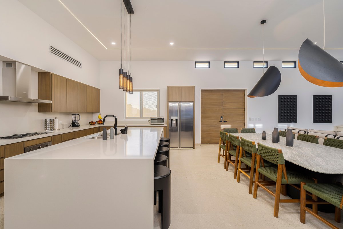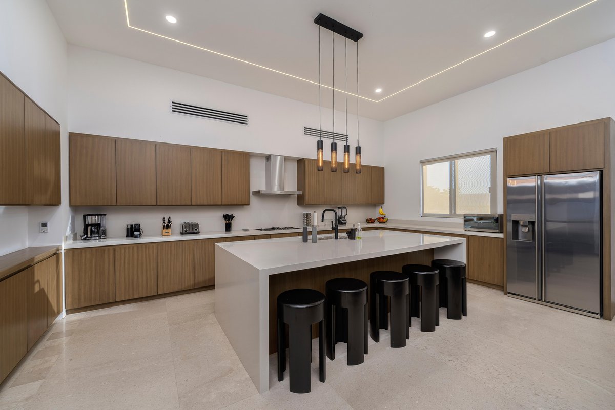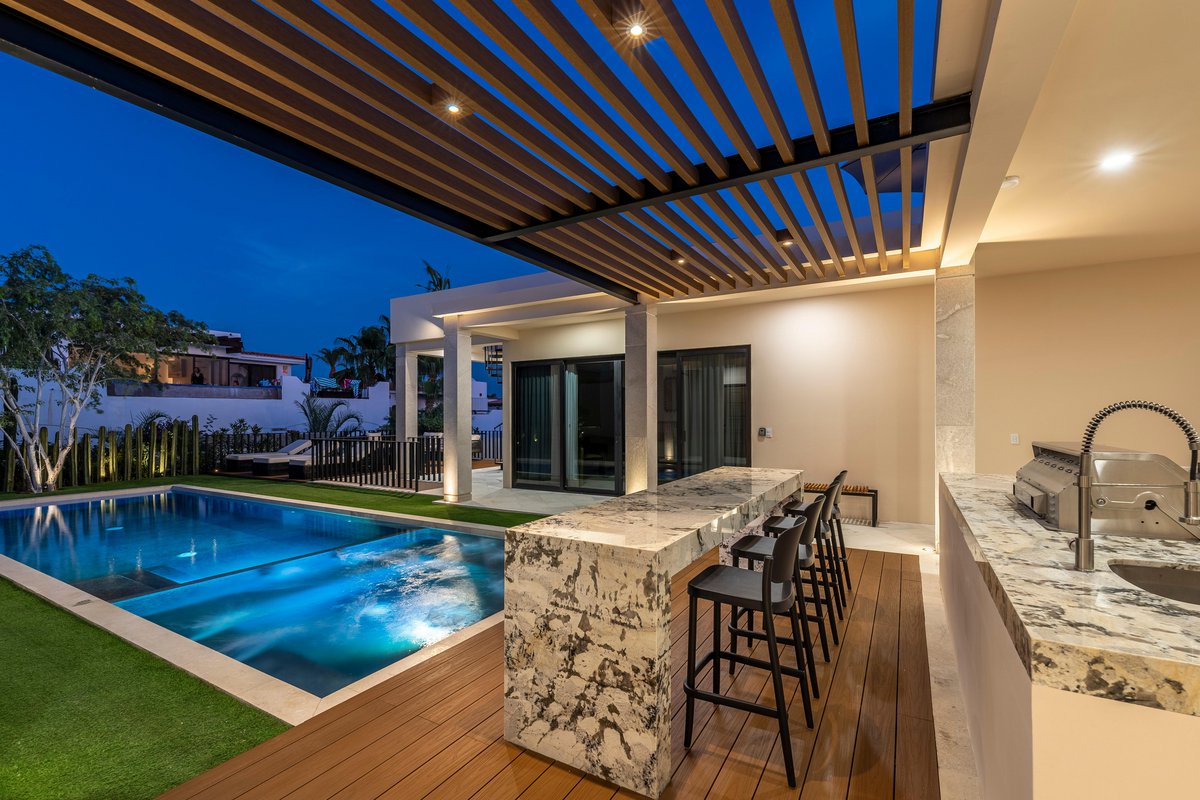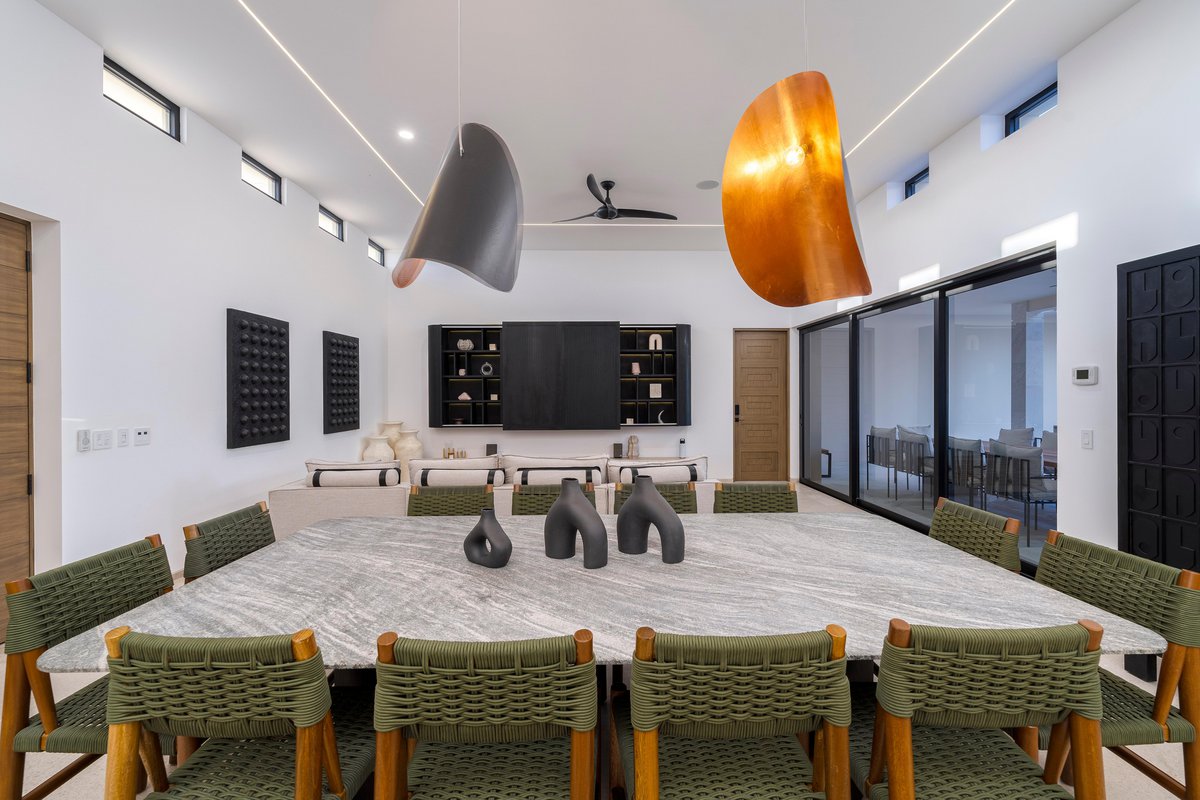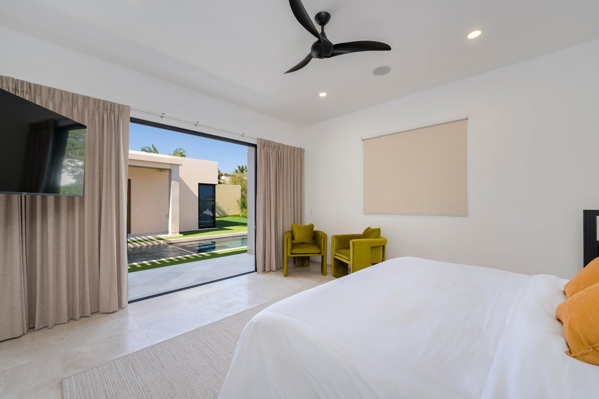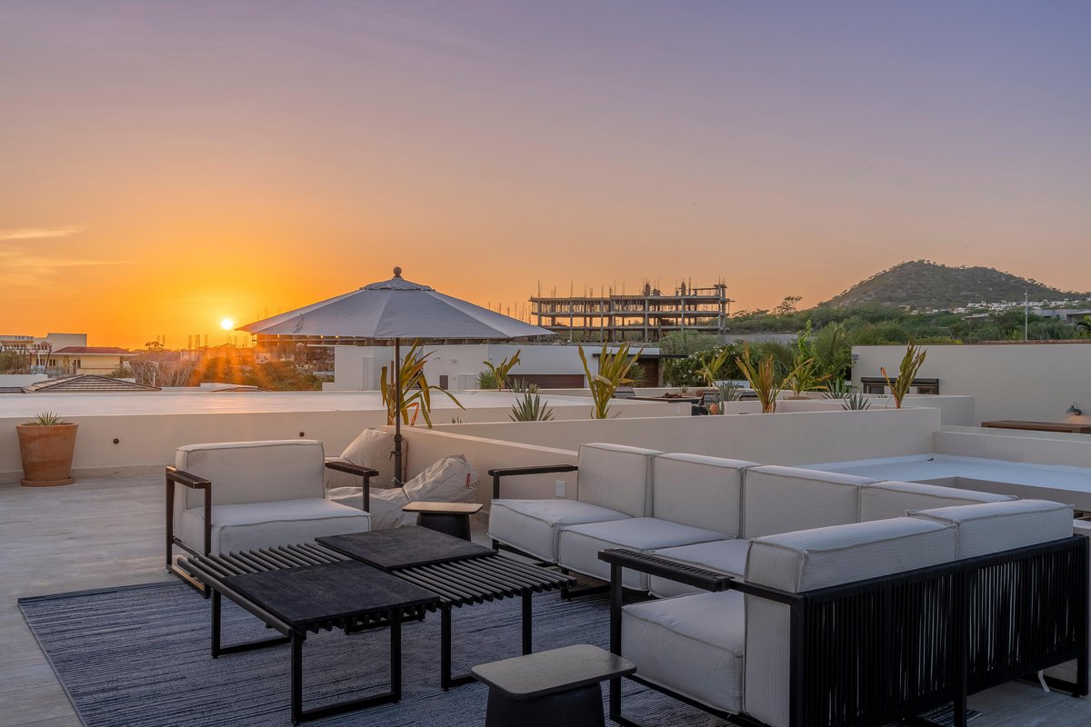 Perched in the gated community of Cresta del Mar, this villa was designed for slow mornings, golden sunsets, and everything in between. Outside, you’ll find a private pool and hot tub, a rooftop lounge with panoramic views, and multiple spaces made for gathering—like the firepit deck, alfresco dining area, and a shaded outdoor bar under the pergola.