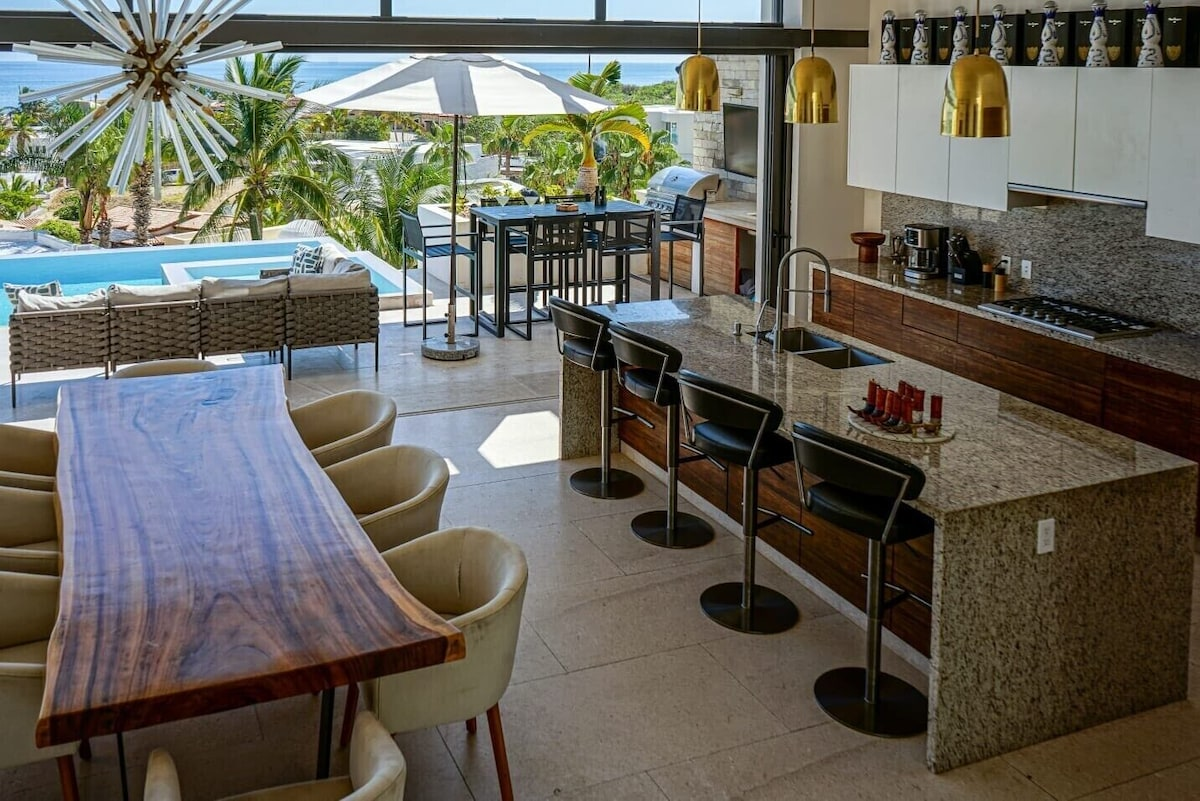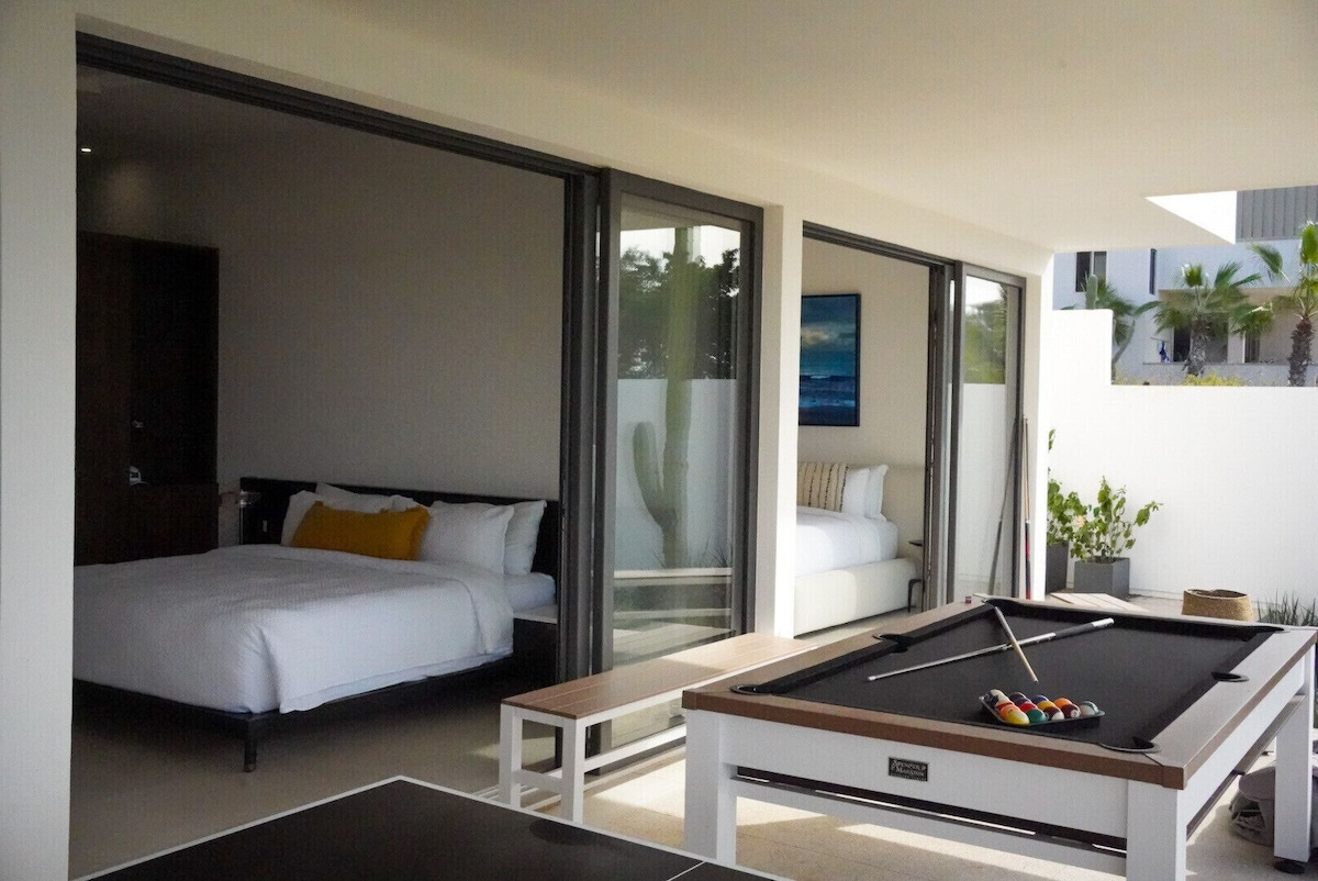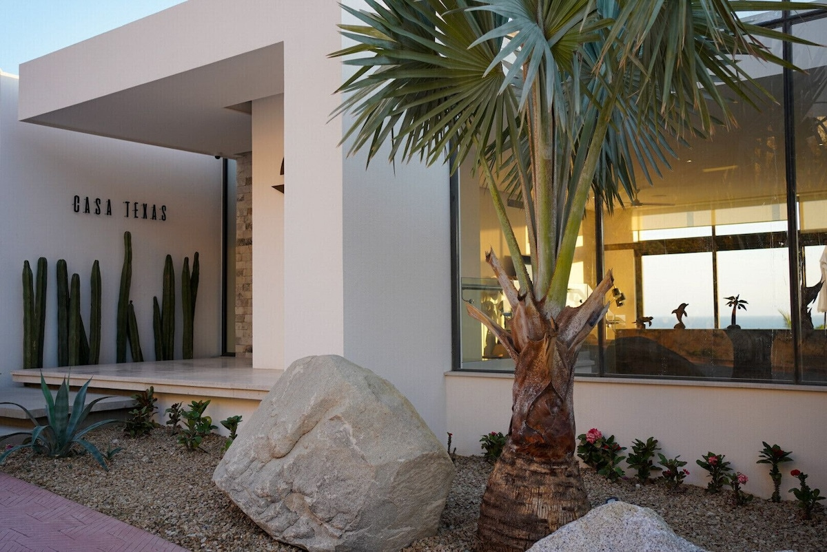 Set inside Pedregal, Cabo’s most prestigious hillside community with 24/7 security, cobblestone streets, and access to tennis and basketball courts, Casa Texas is a modern estate built for groups that like to stay active and entertained. Pedregal Beach is just a short walk away, while Medano Beach and downtown Cabo are minutes by car—though with everything this villa offers, you may never want to leave.
