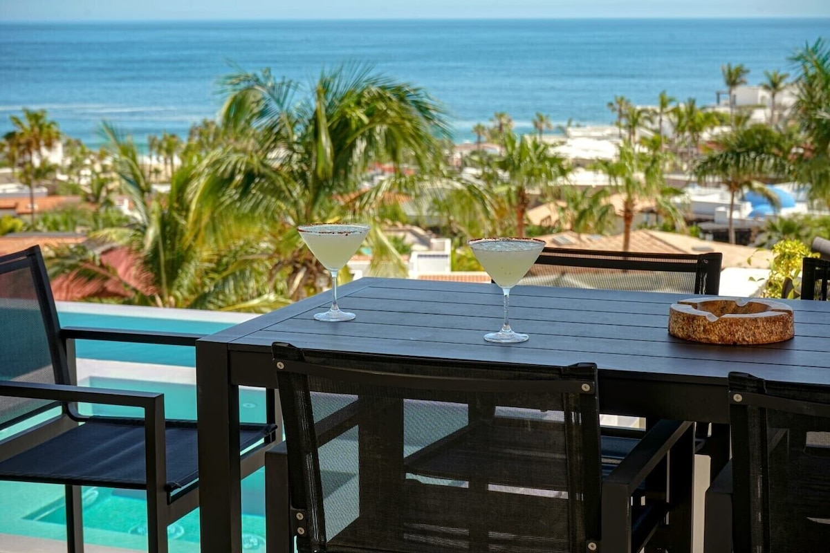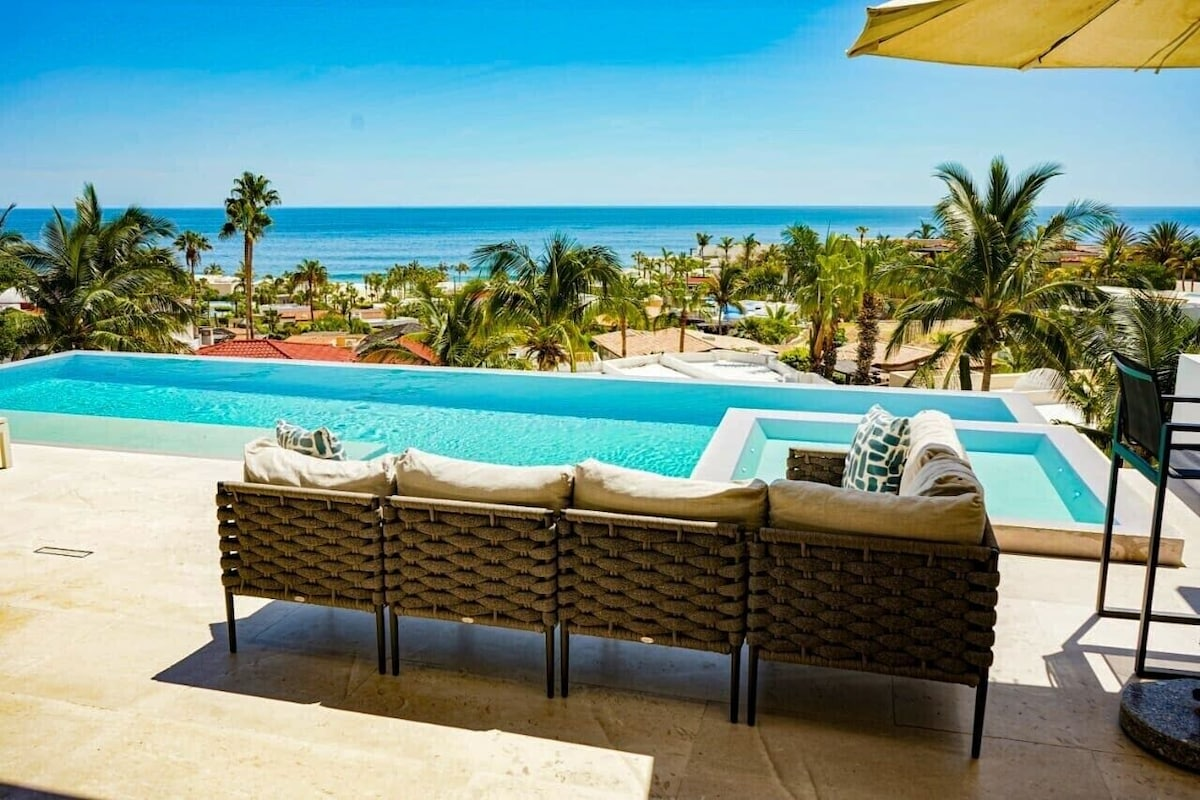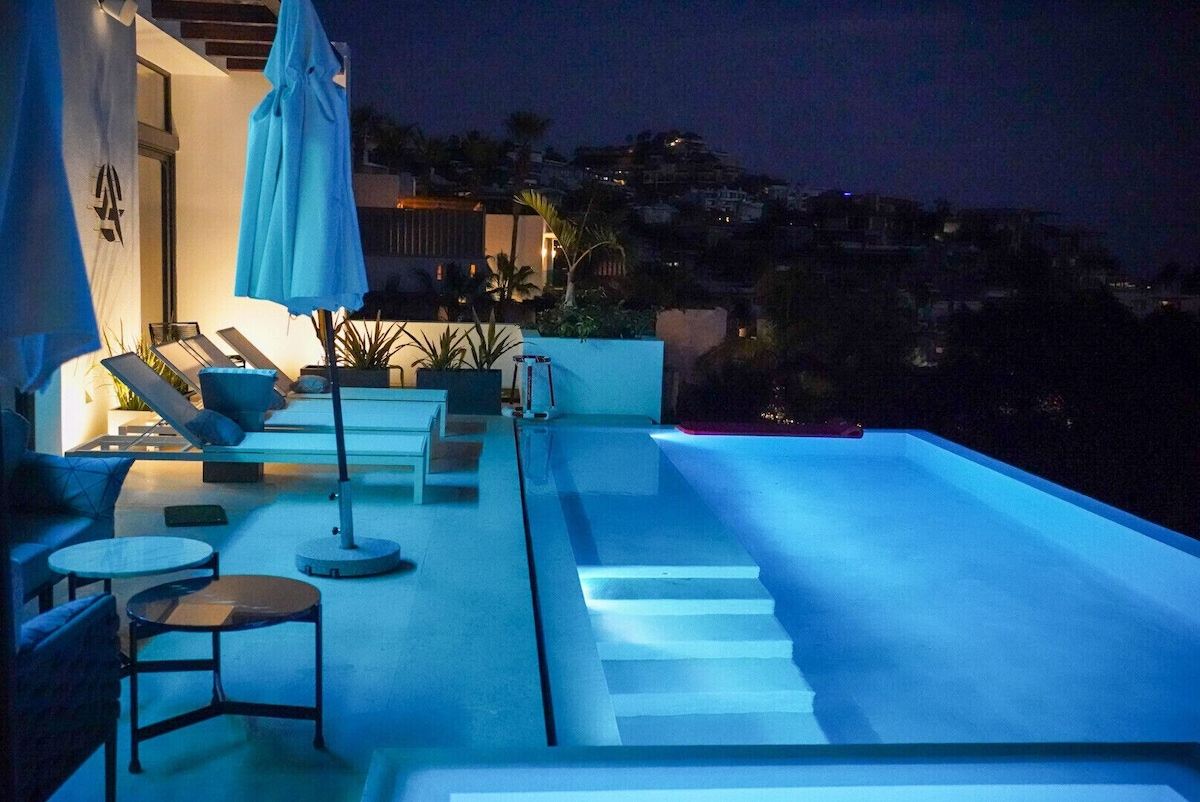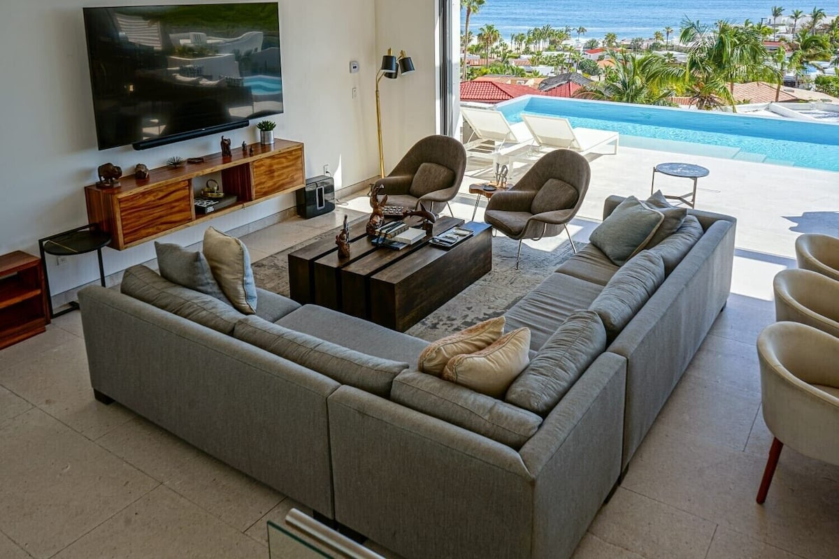 Set inside Pedregal, Cabo’s most prestigious hillside community with 24/7 security, cobblestone streets, and access to tennis and basketball courts, Casa Texas is a modern estate built for groups that like to stay active and entertained. Pedregal Beach is just a short walk away, while Medano Beach and downtown Cabo are minutes by car—though with everything this villa offers, you may never want to leave.
