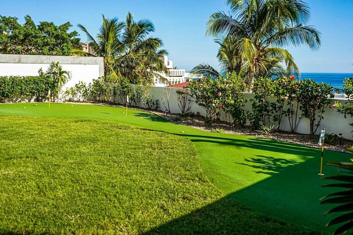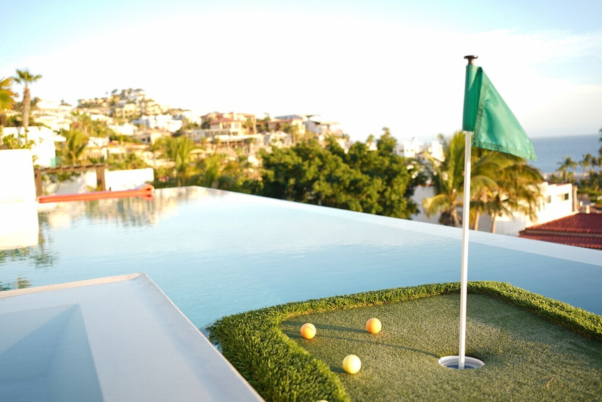 Entertainment everywhere: pool table, ping pong, SkyTrak golf simulator, and a professional chip-and-putting green