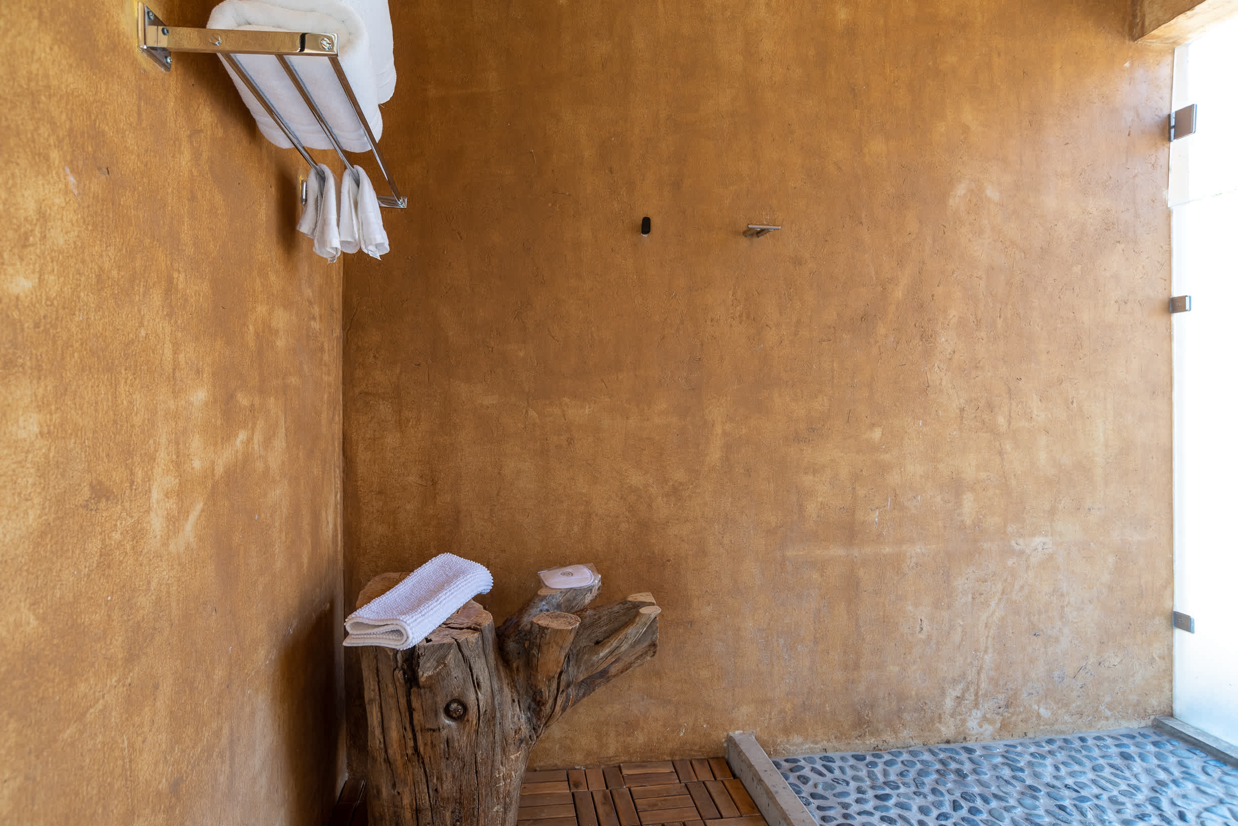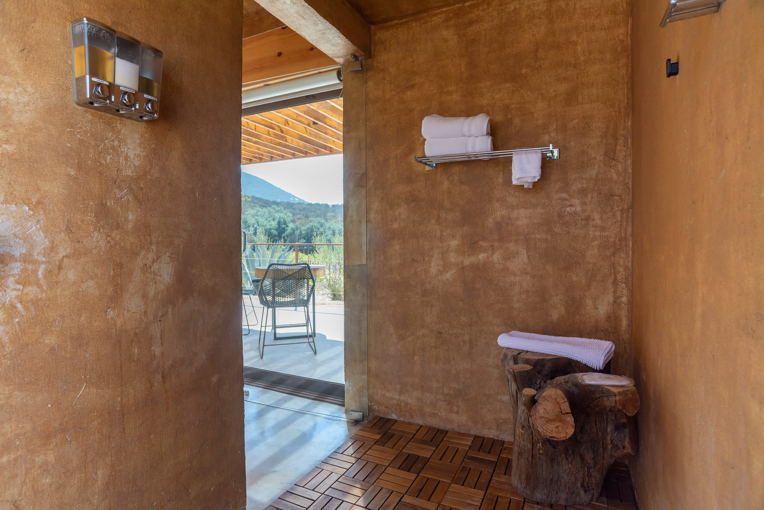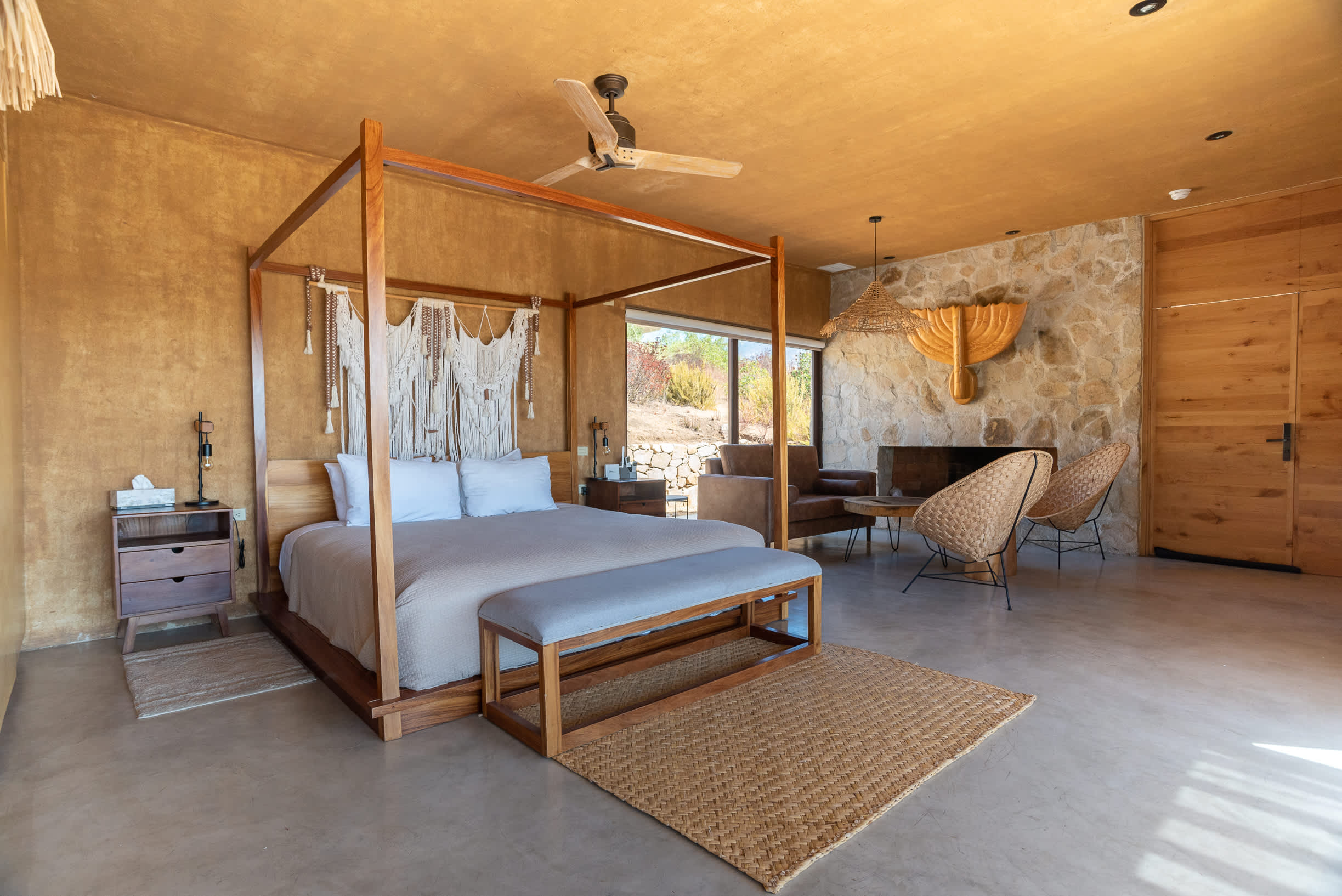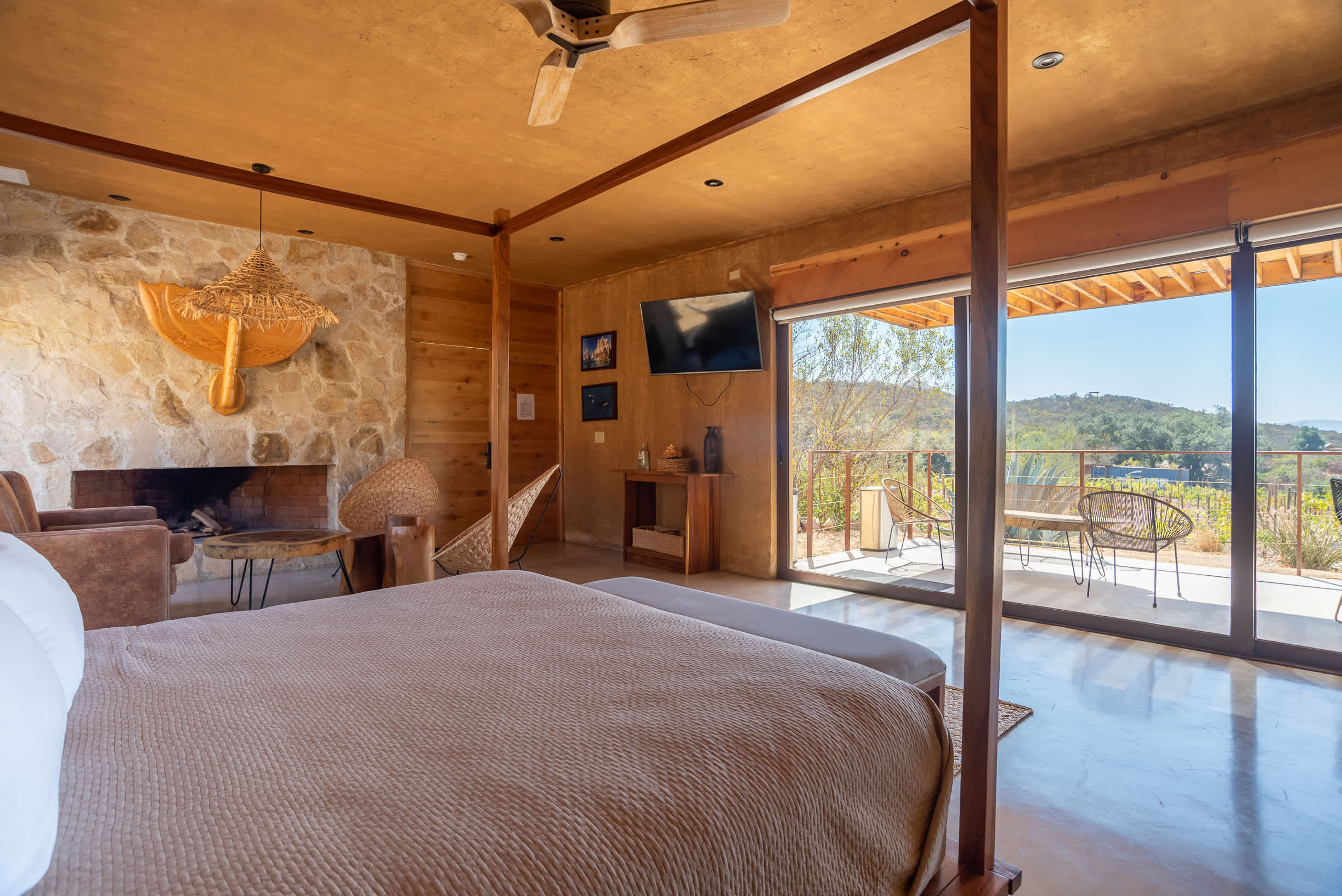 Inside, you’ll find a luxurious king-size bed, a lounge seating area, a TV, an indoor fireplace, and a minibar with complimentary refreshments. The private terrace features a seating area, perfect for relaxing while enjoying the serene surroundings.