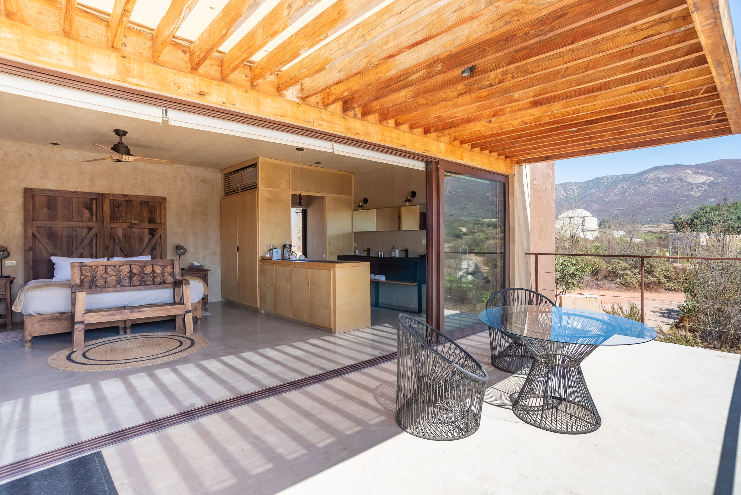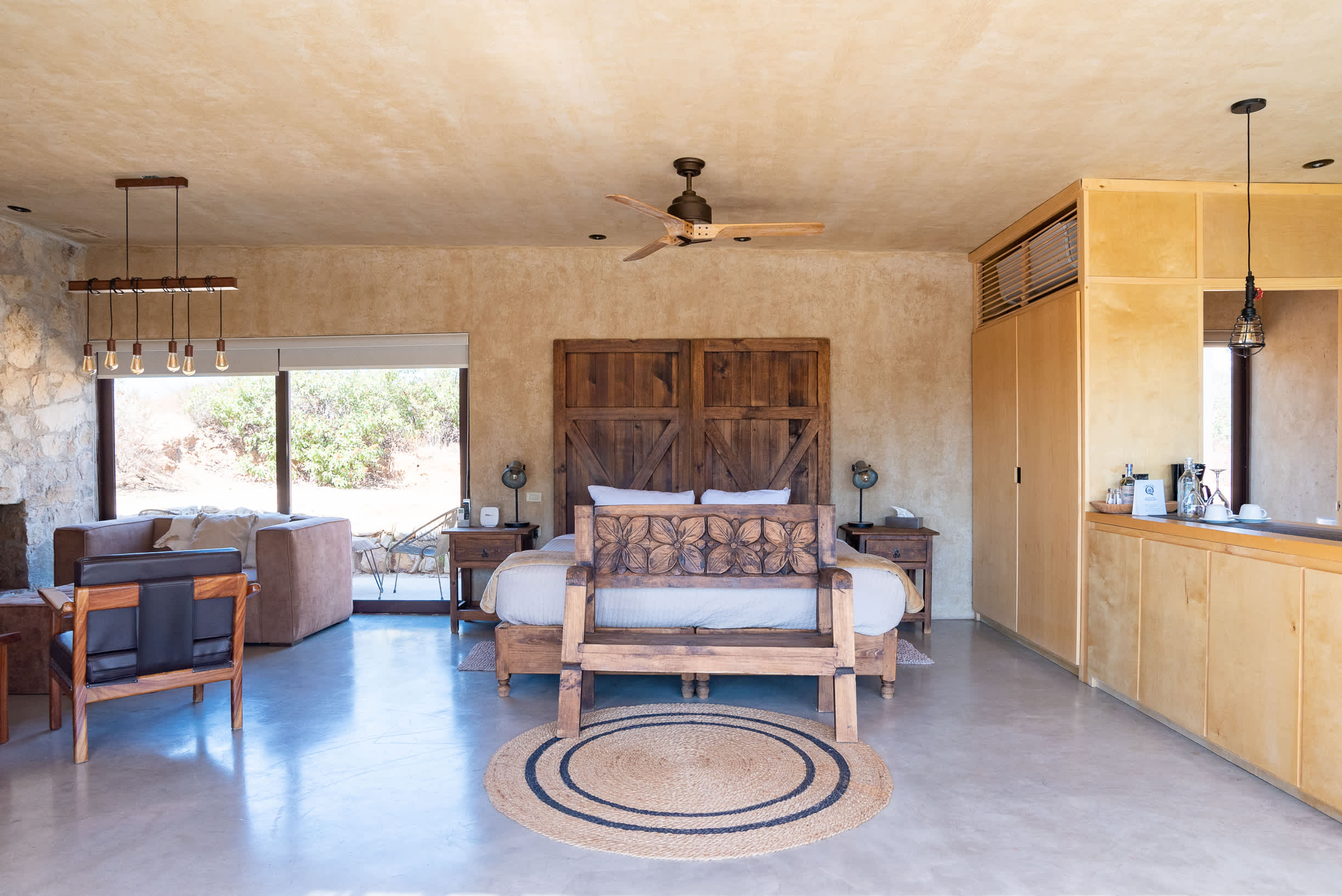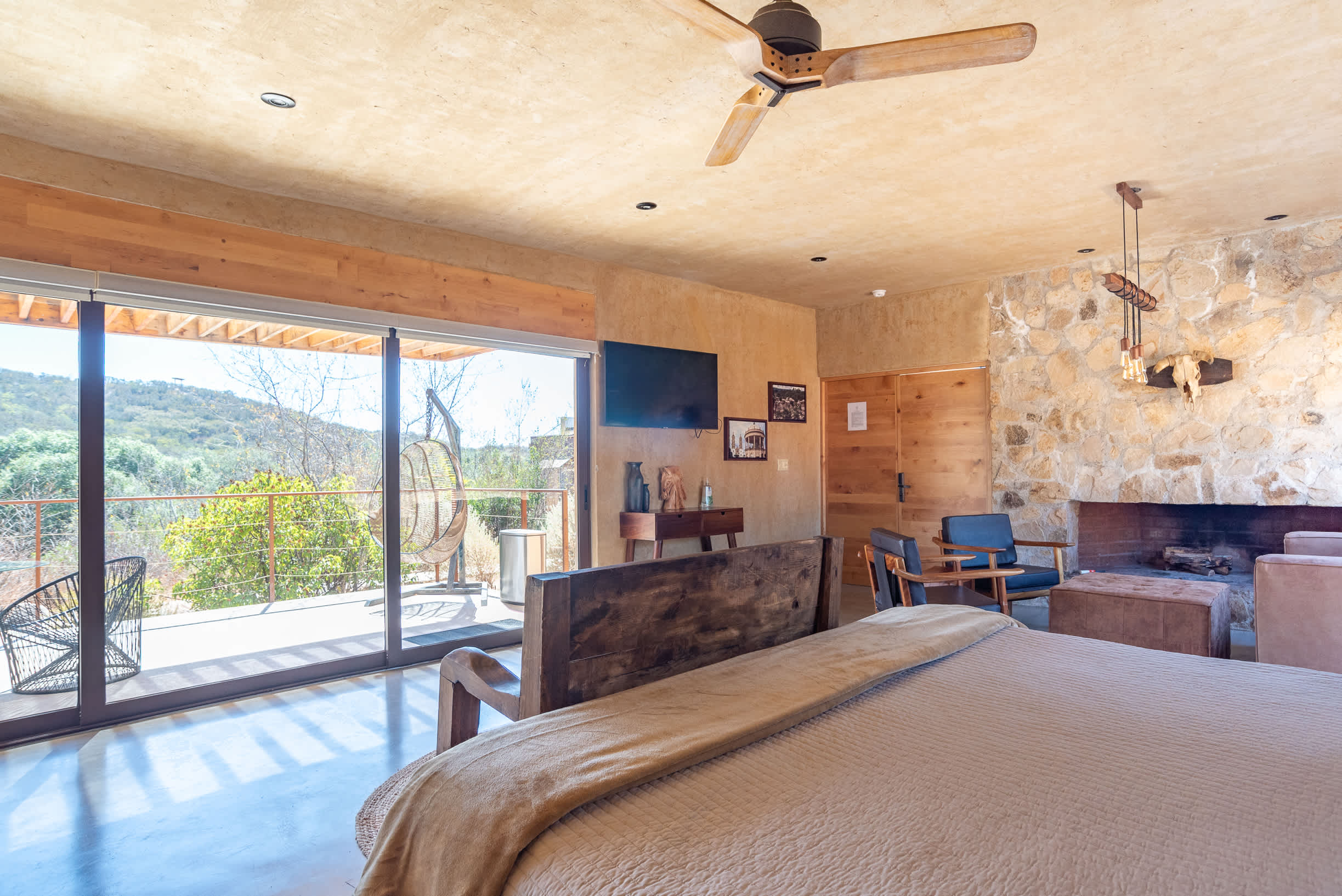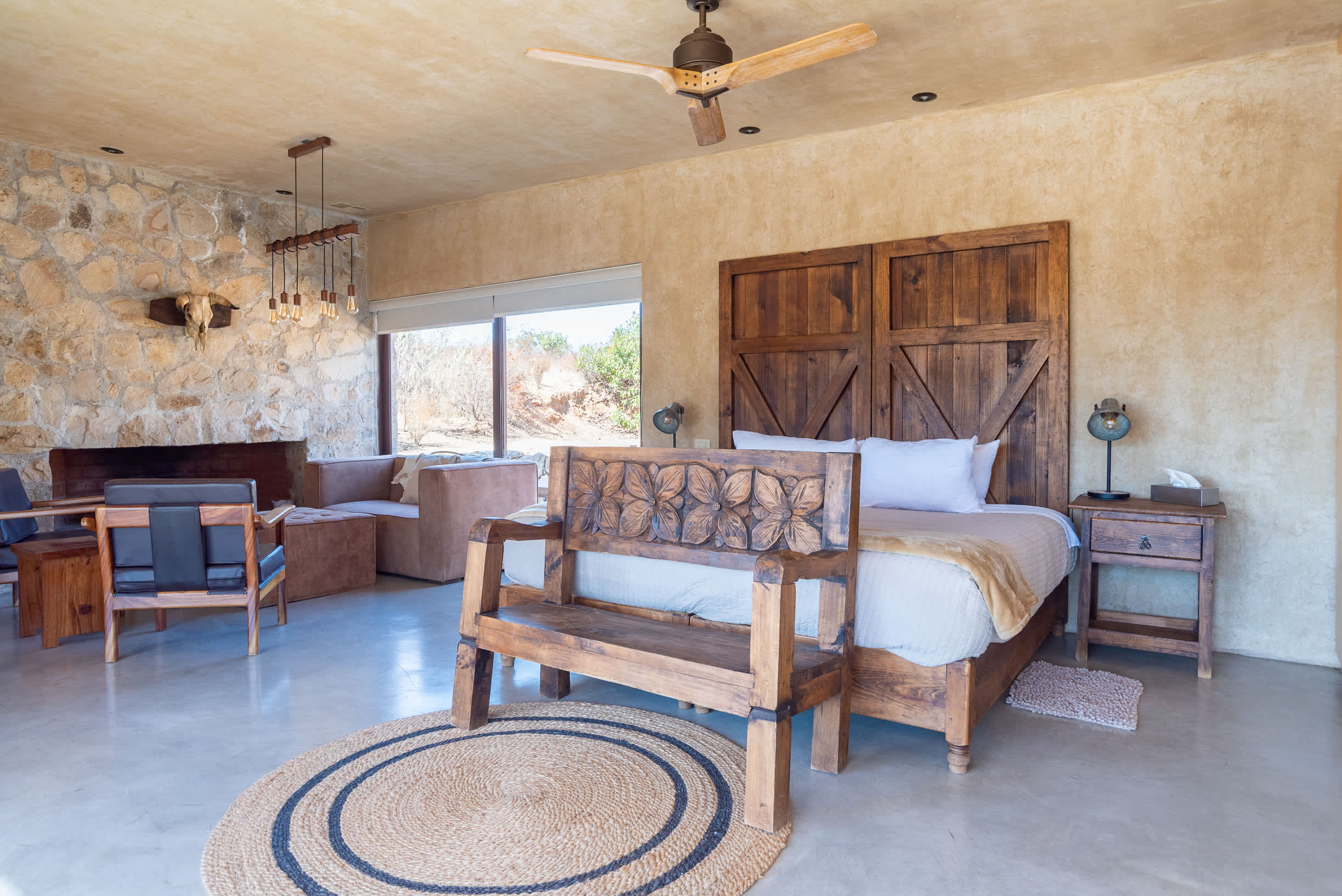 Inside, you’ll find a luxurious king-size bed, a lounge seating area, a TV, an indoor fireplace, and a minibar with complimentary refreshments. The private terrace features a seating area, perfect for relaxing while enjoying the serene surroundings.