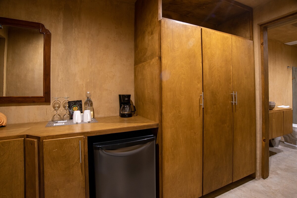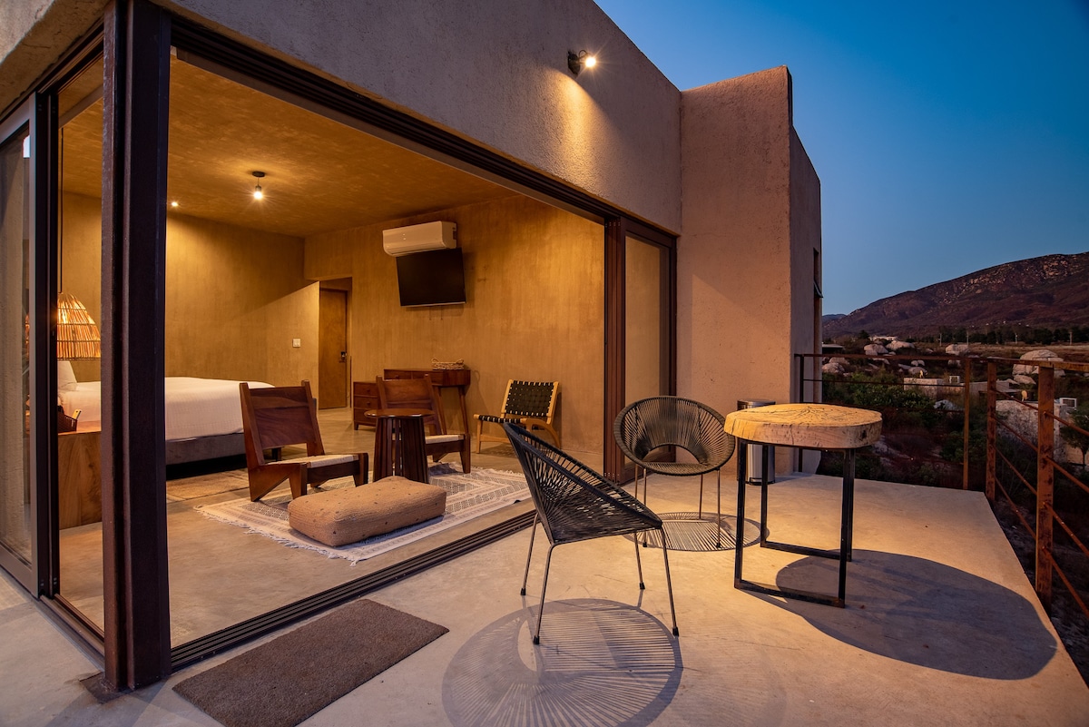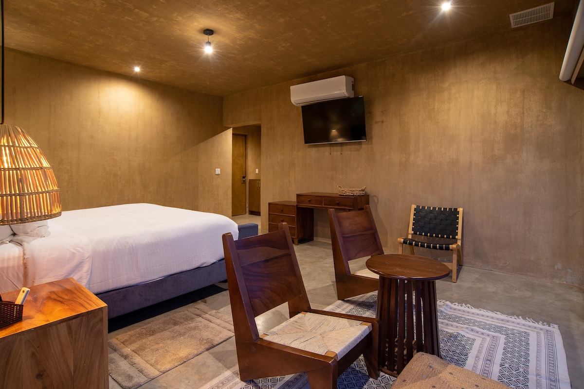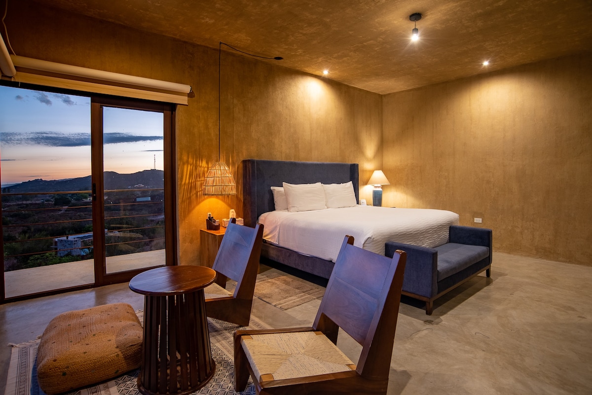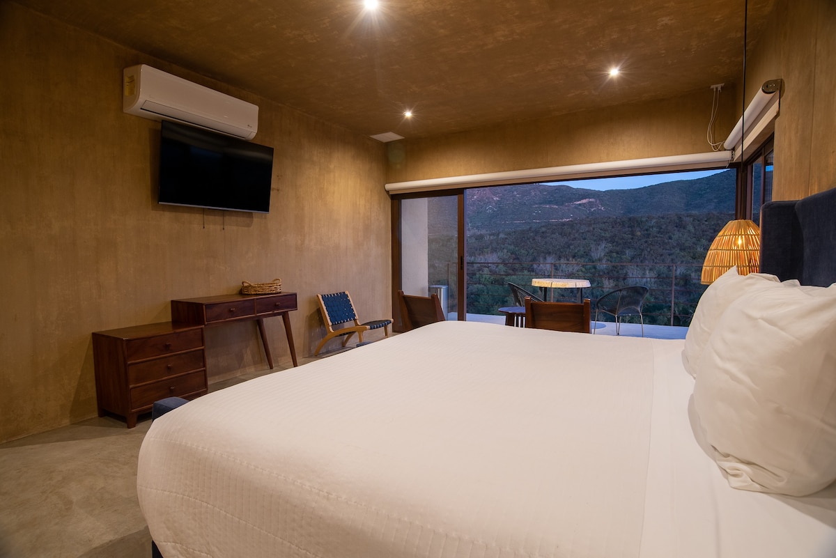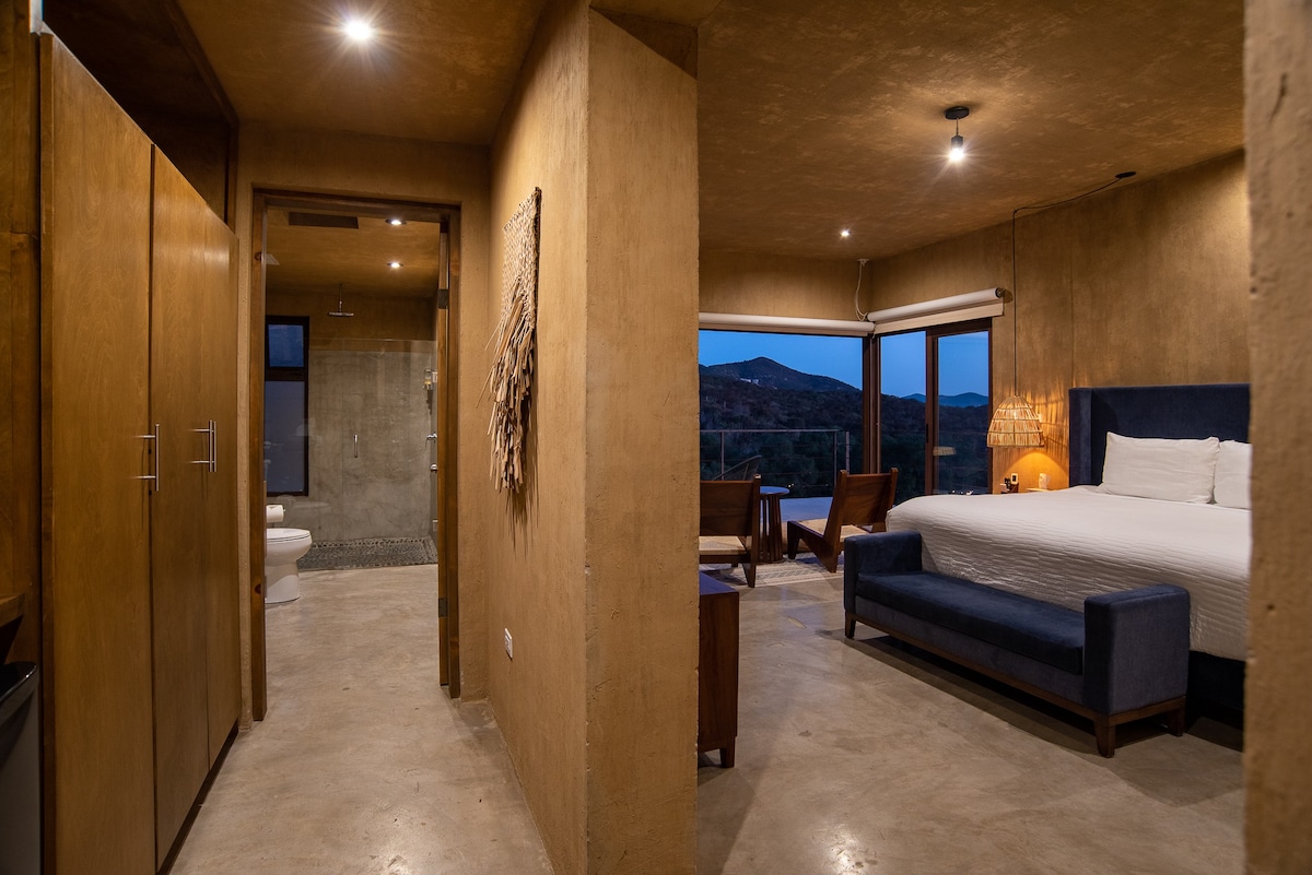 Inside, you'll find a luxurious king-size bed with top-quality linens, a full bathroom, a TV for your entertainment, and a minibar stocked with complimentary refreshments. Step out onto your private terrace, complete with a seating area, where you can relax and enjoy the amazing views.