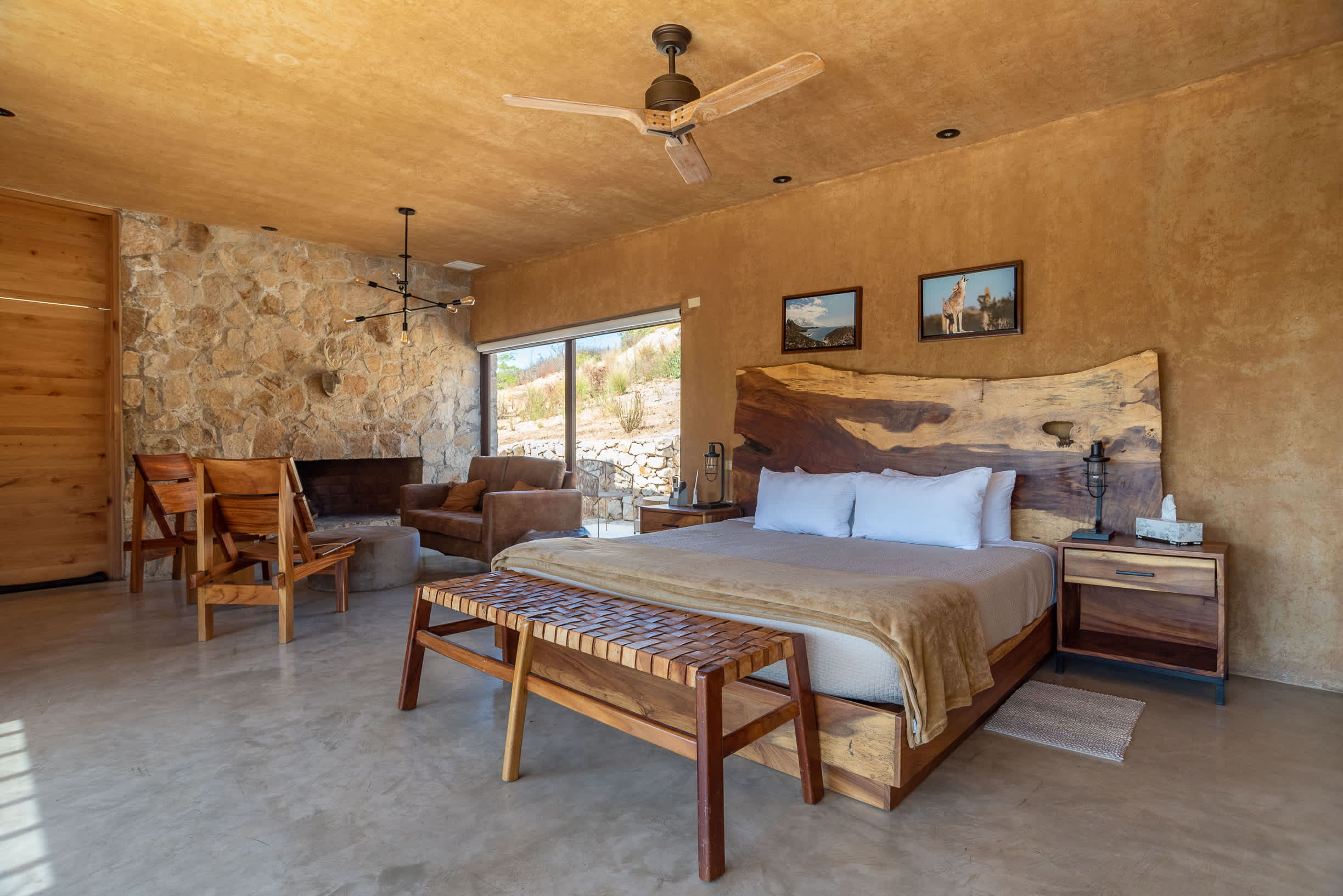 Inside, you’ll find a luxurious king-size bed, a lounge seating area, a TV, an indoor fireplace, and a minibar with complimentary refreshments. The private terrace features a seating area, perfect for relaxing while enjoying the serene surroundings.