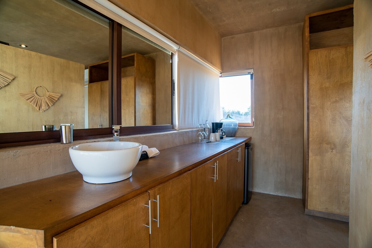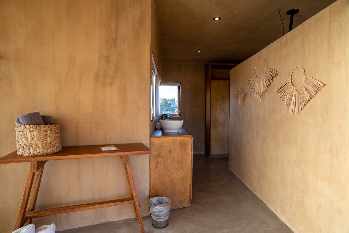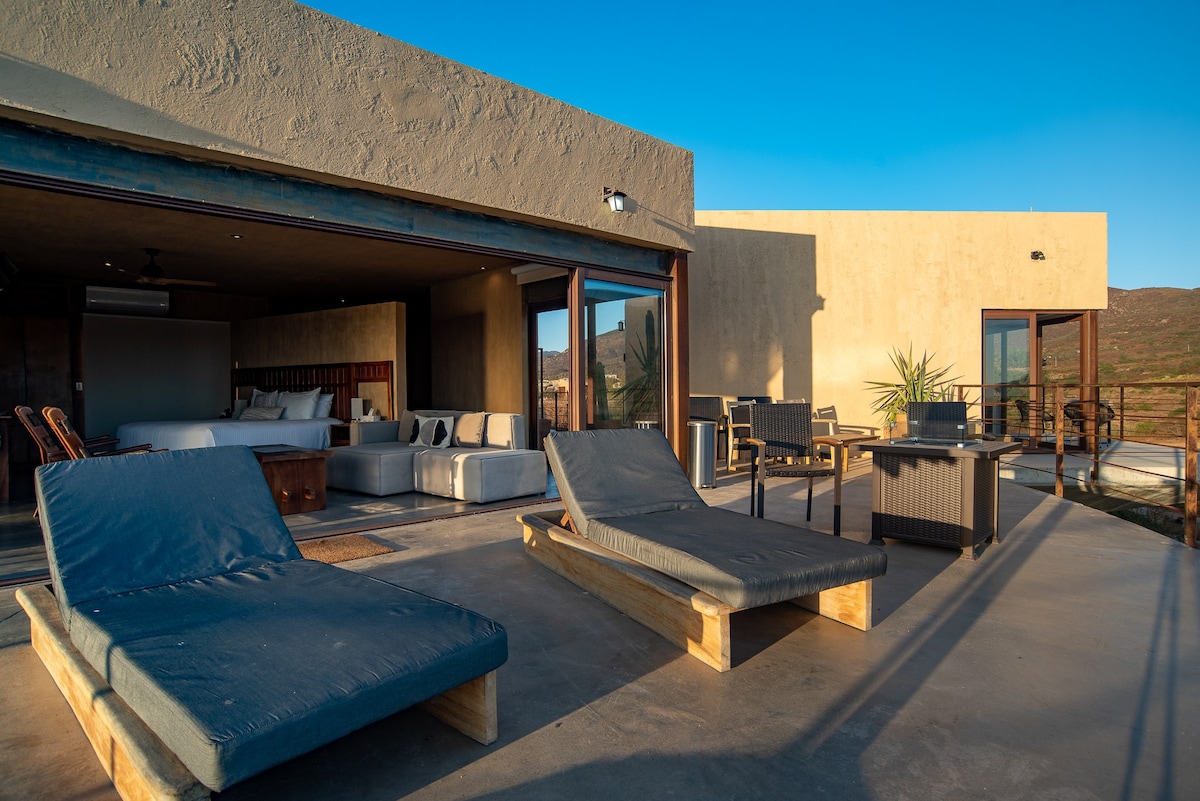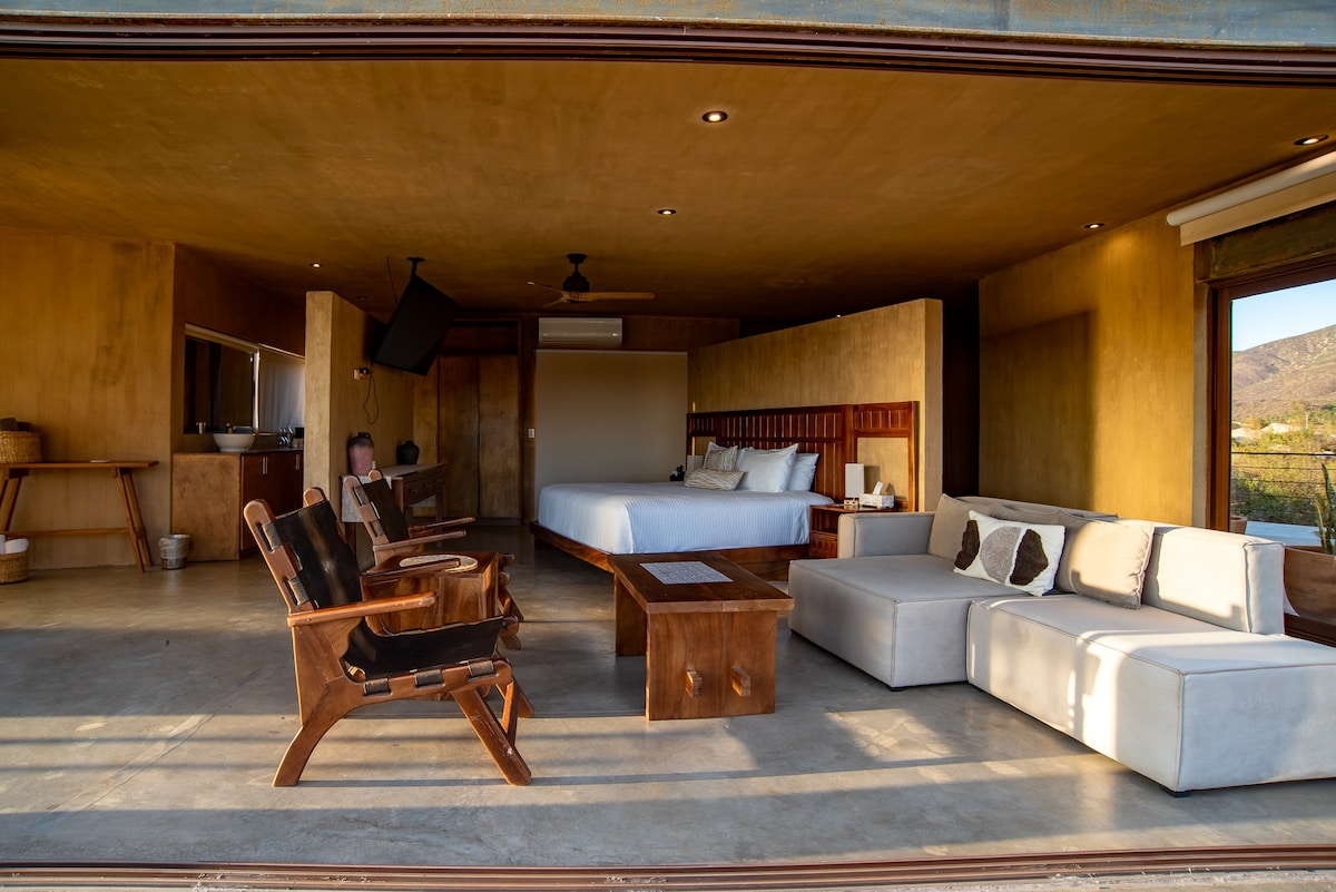 Inside, you’ll find a luxurious king-size bed, a full bathroom, a TV, a minibar with complimentary refreshments, and a cozy living room. Step out onto your private terrace, featuring a pool that can be heated and turned into a jacuzzi, as well as a firepit with a seating area for ultimate relaxation.