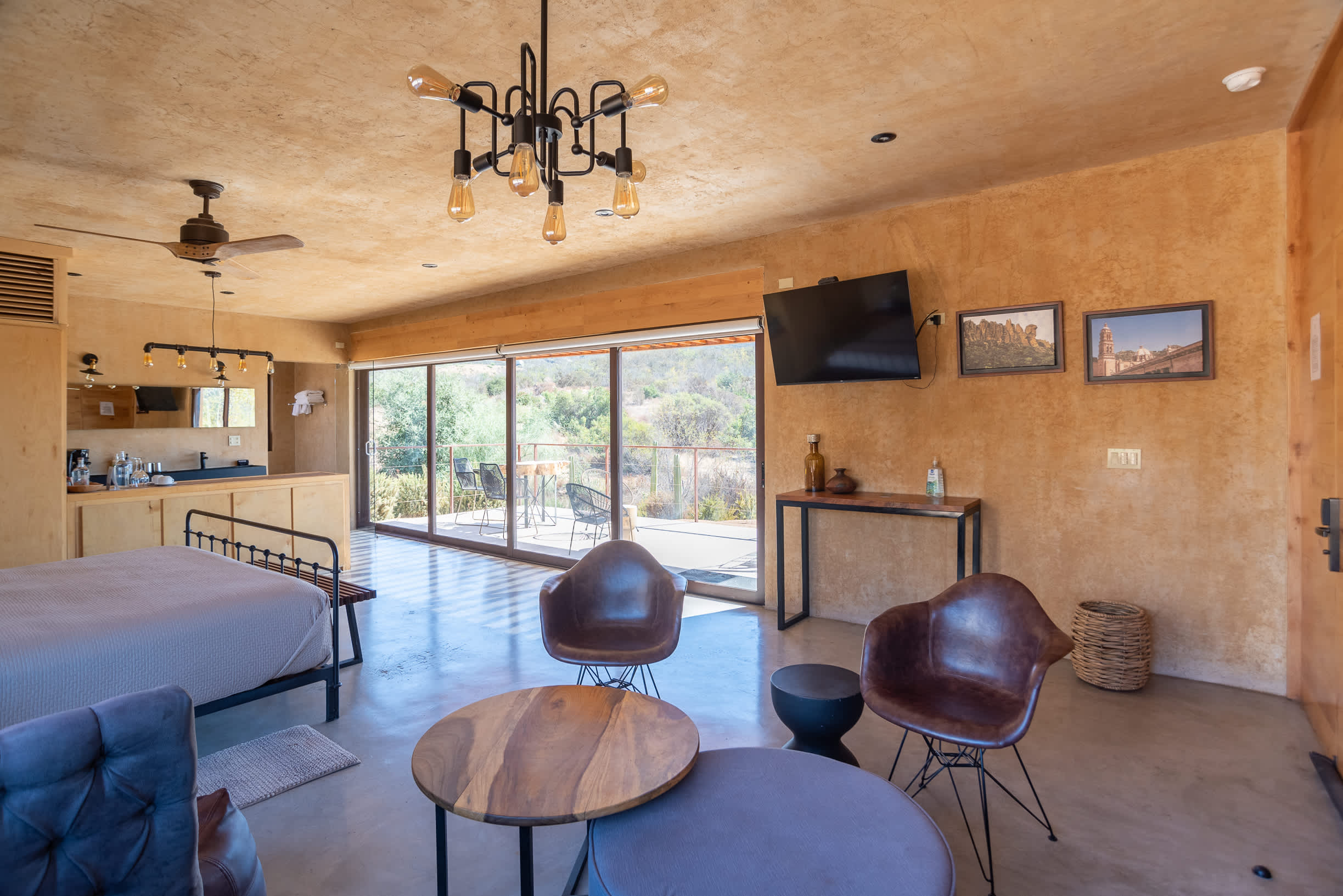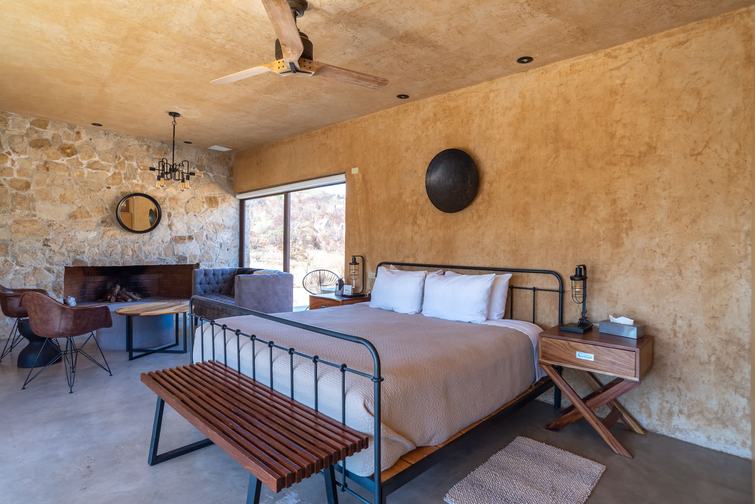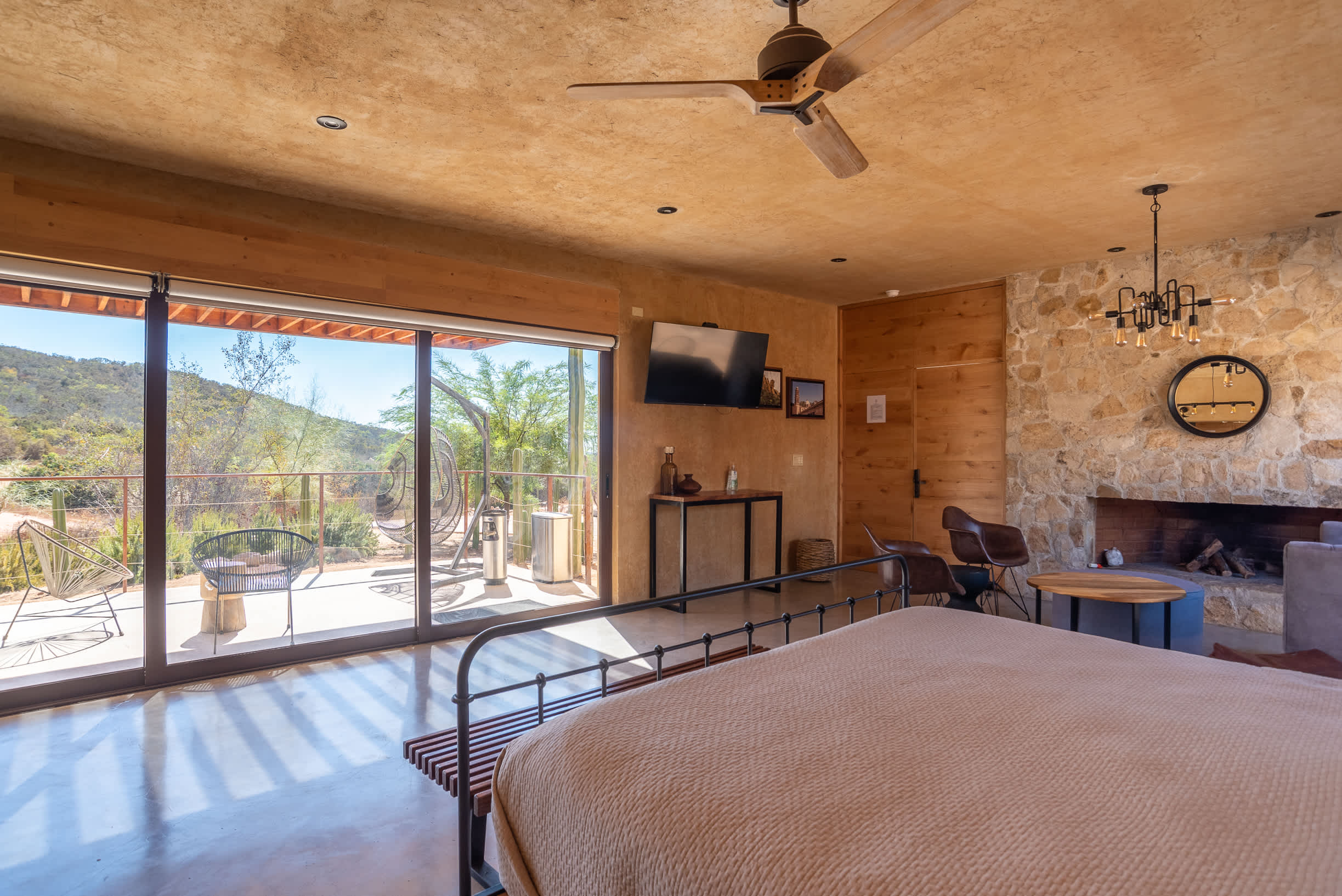 Inside, you’ll find a luxurious king-size bed, a lounge seating area, a TV, an indoor fireplace, and a minibar with complimentary refreshments. The private terrace features a seating area, perfect for relaxing while enjoying the serene surroundings.