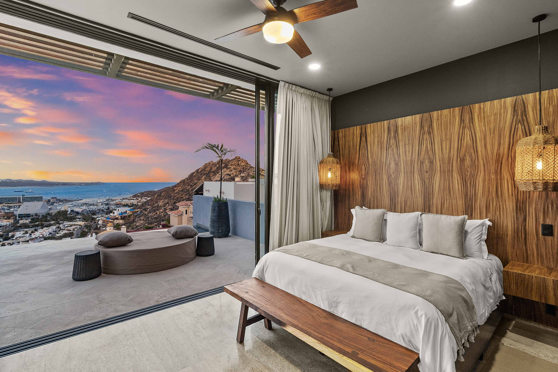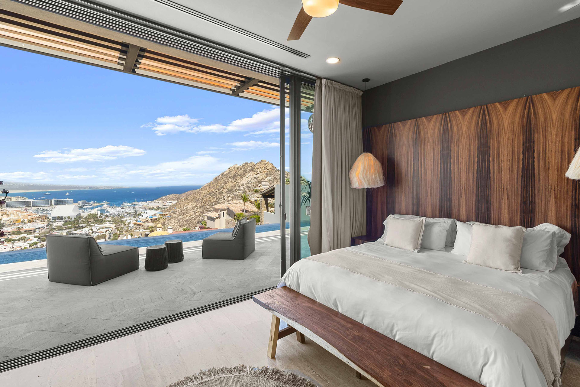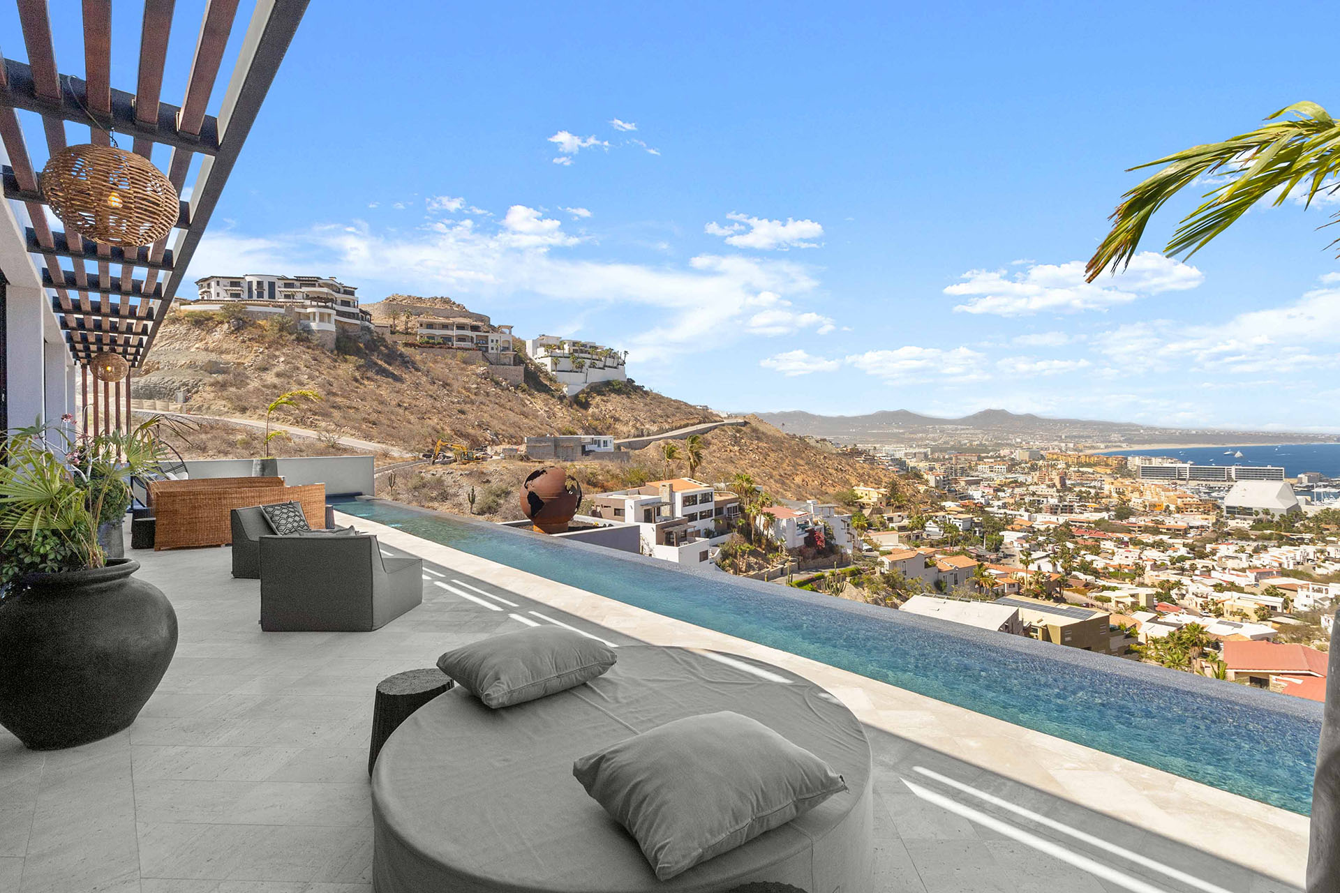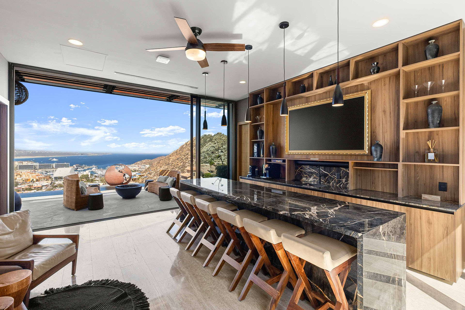 Inside, every detail feels intentional. Teak and cedar finishes, onyx and granite countertops, and ocean views from almost every room come together to create a space that’s both refined and relaxed. The gourmet chef’s kitchen is designed for those who love to gather, while the butler’s prep kitchen keeps things seamless behind the scenes. Outdoors, two pools, a jacuzzi, and fire features stretch across multiple levels — perfect for lounging by day or taking in Cabo’s glittering skyline by night.