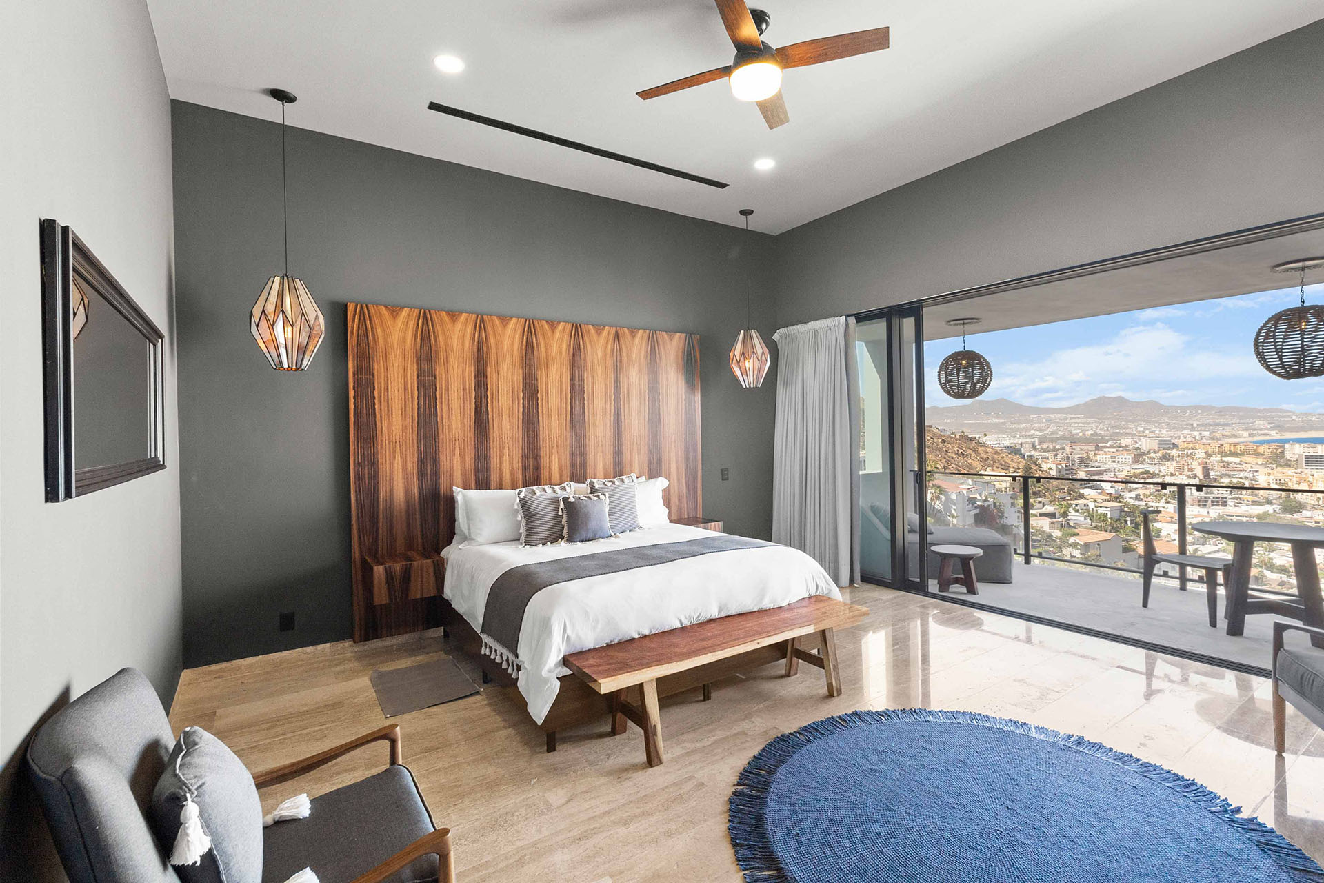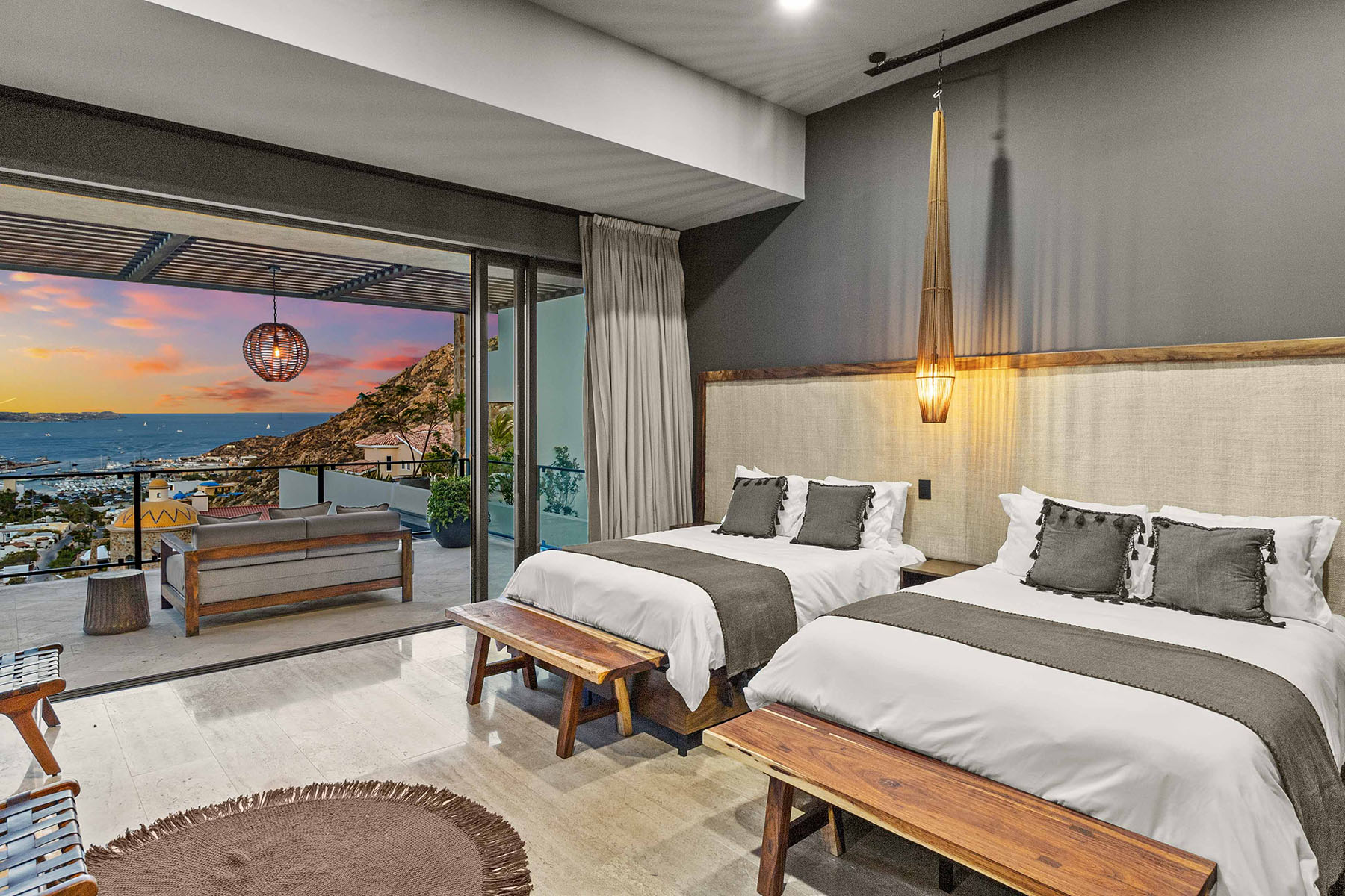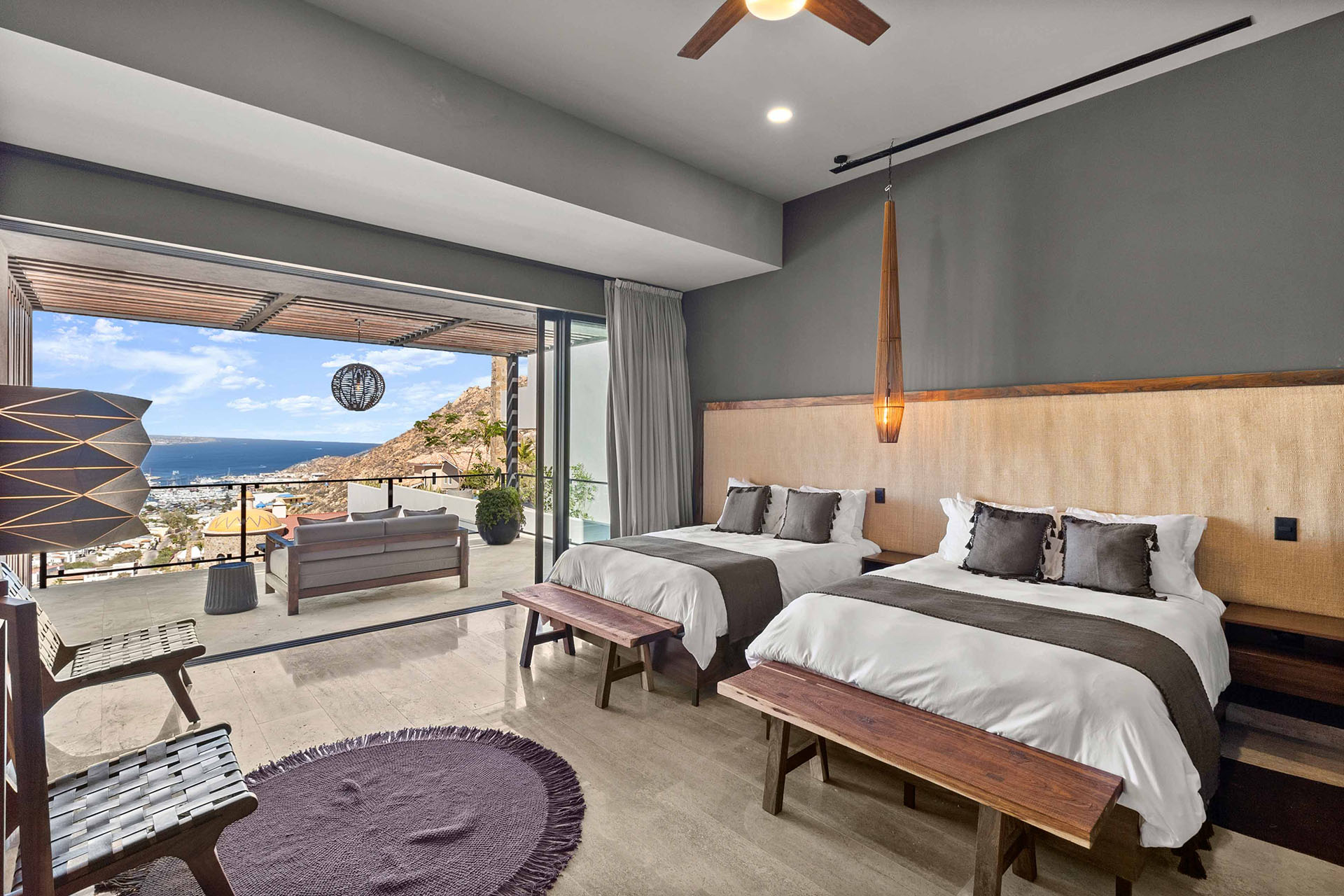 Inside, every detail feels intentional. Teak and cedar finishes, onyx and granite countertops, and ocean views from almost every room come together to create a space that’s both refined and relaxed. The gourmet chef’s kitchen is designed for those who love to gather, while the butler’s prep kitchen keeps things seamless behind the scenes. Outdoors, two pools, a jacuzzi, and fire features stretch across multiple levels — perfect for lounging by day or taking in Cabo’s glittering skyline by night.