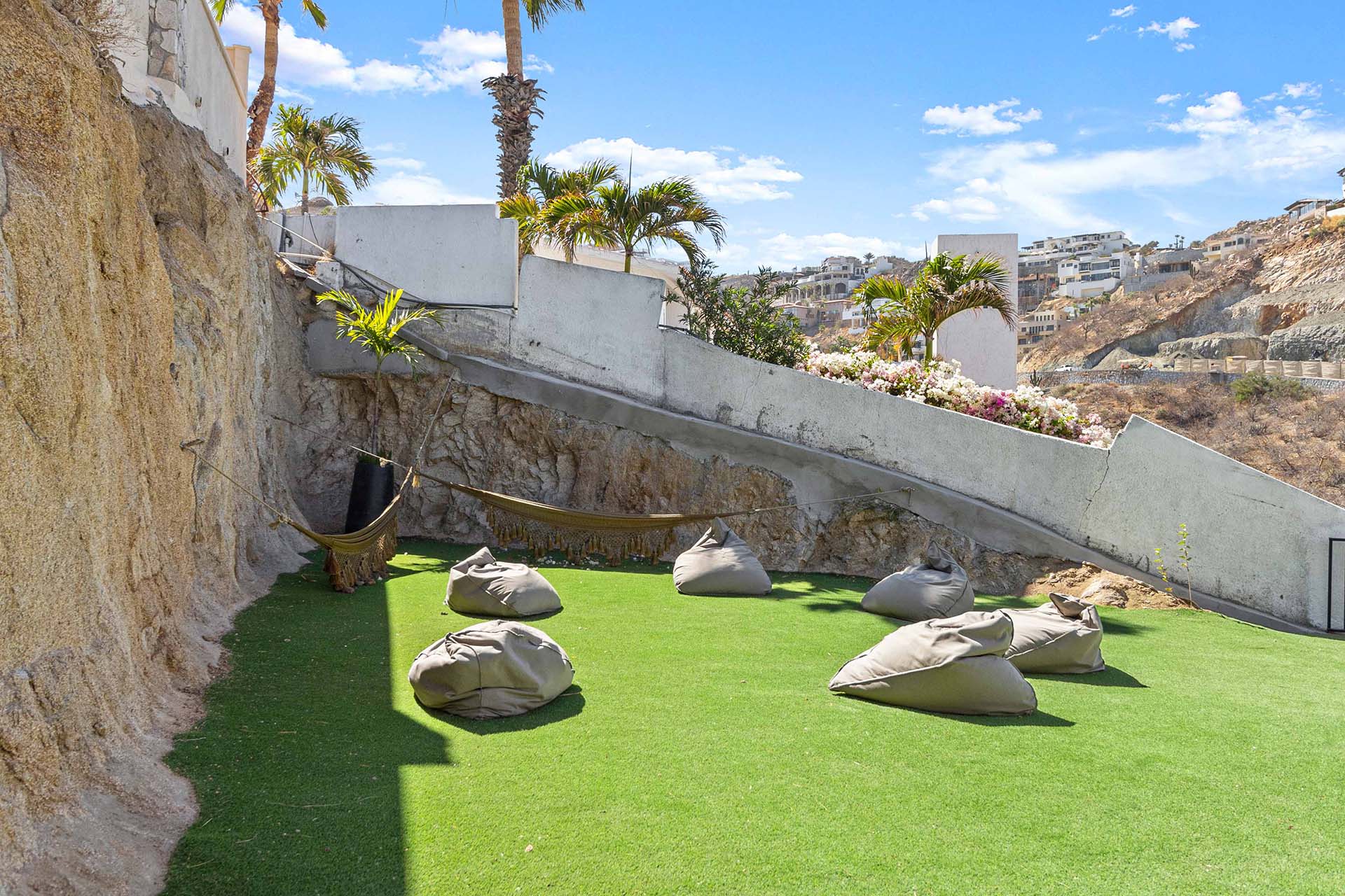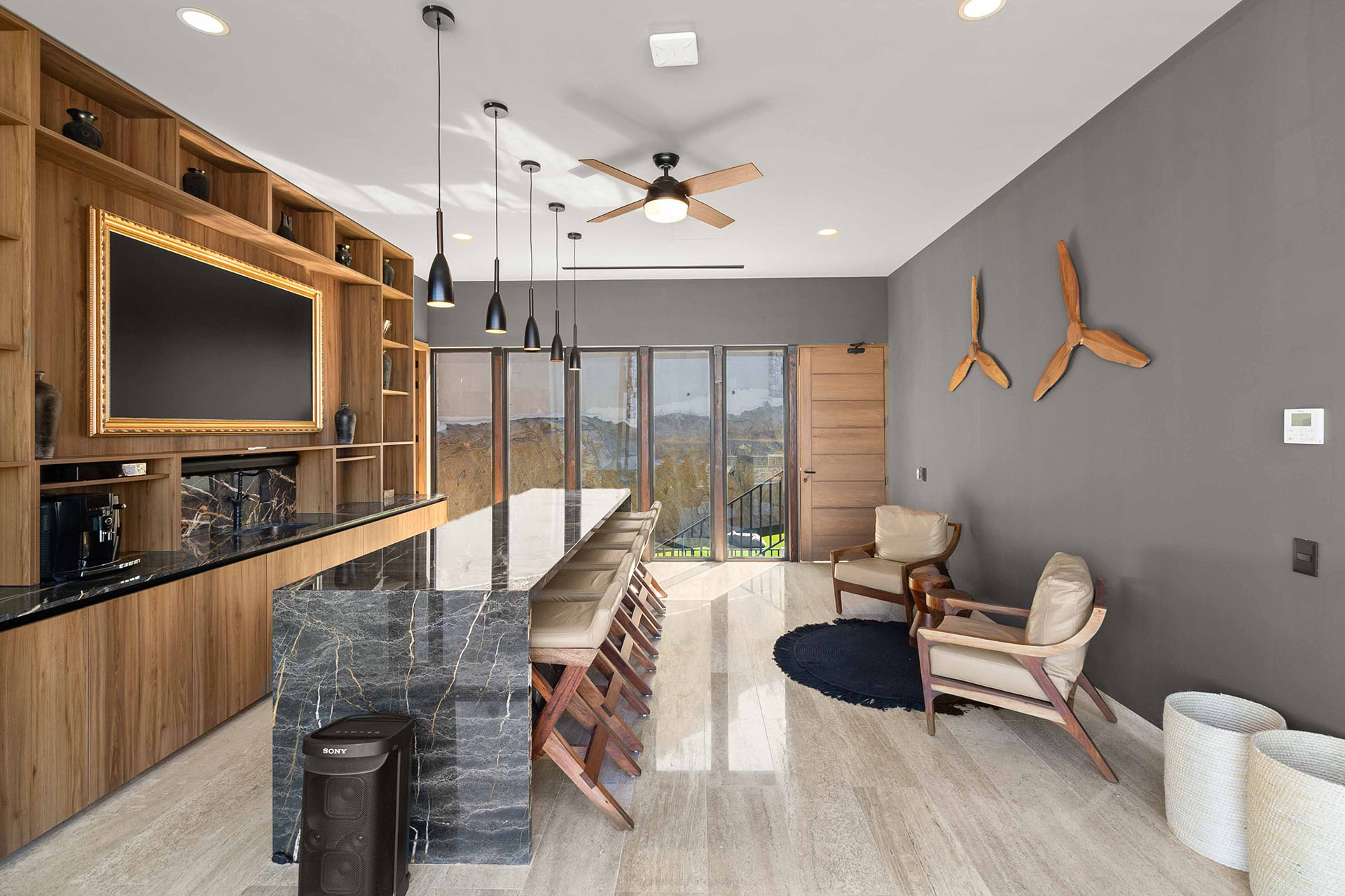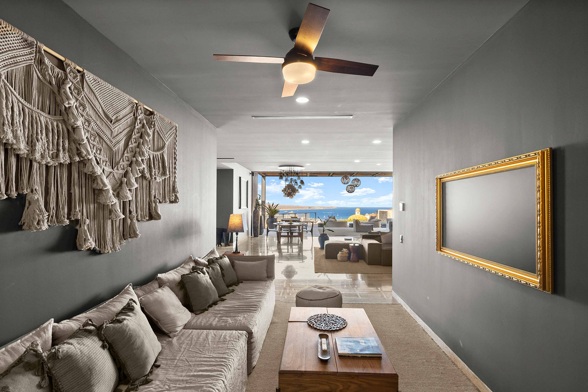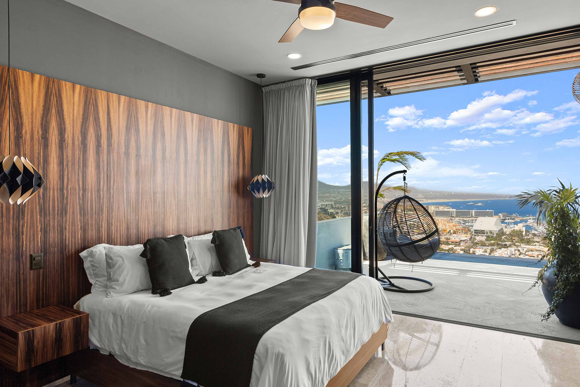 Inside, every detail feels intentional. Teak and cedar finishes, onyx and granite countertops, and ocean views from almost every room come together to create a space that’s both refined and relaxed. The gourmet chef’s kitchen is designed for those who love to gather, while the butler’s prep kitchen keeps things seamless behind the scenes. Outdoors, two pools, a jacuzzi, and fire features stretch across multiple levels — perfect for lounging by day or taking in Cabo’s glittering skyline by night.
