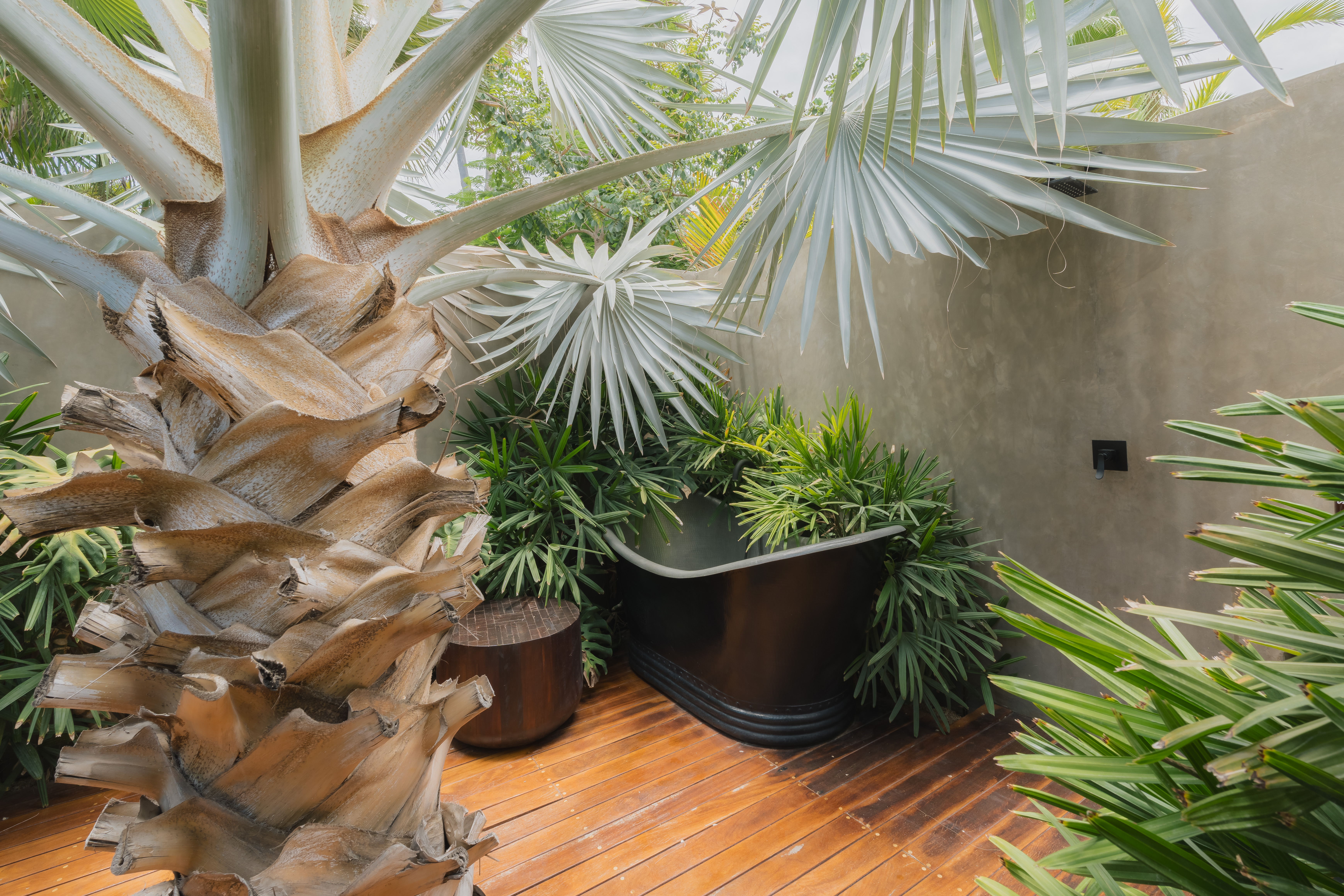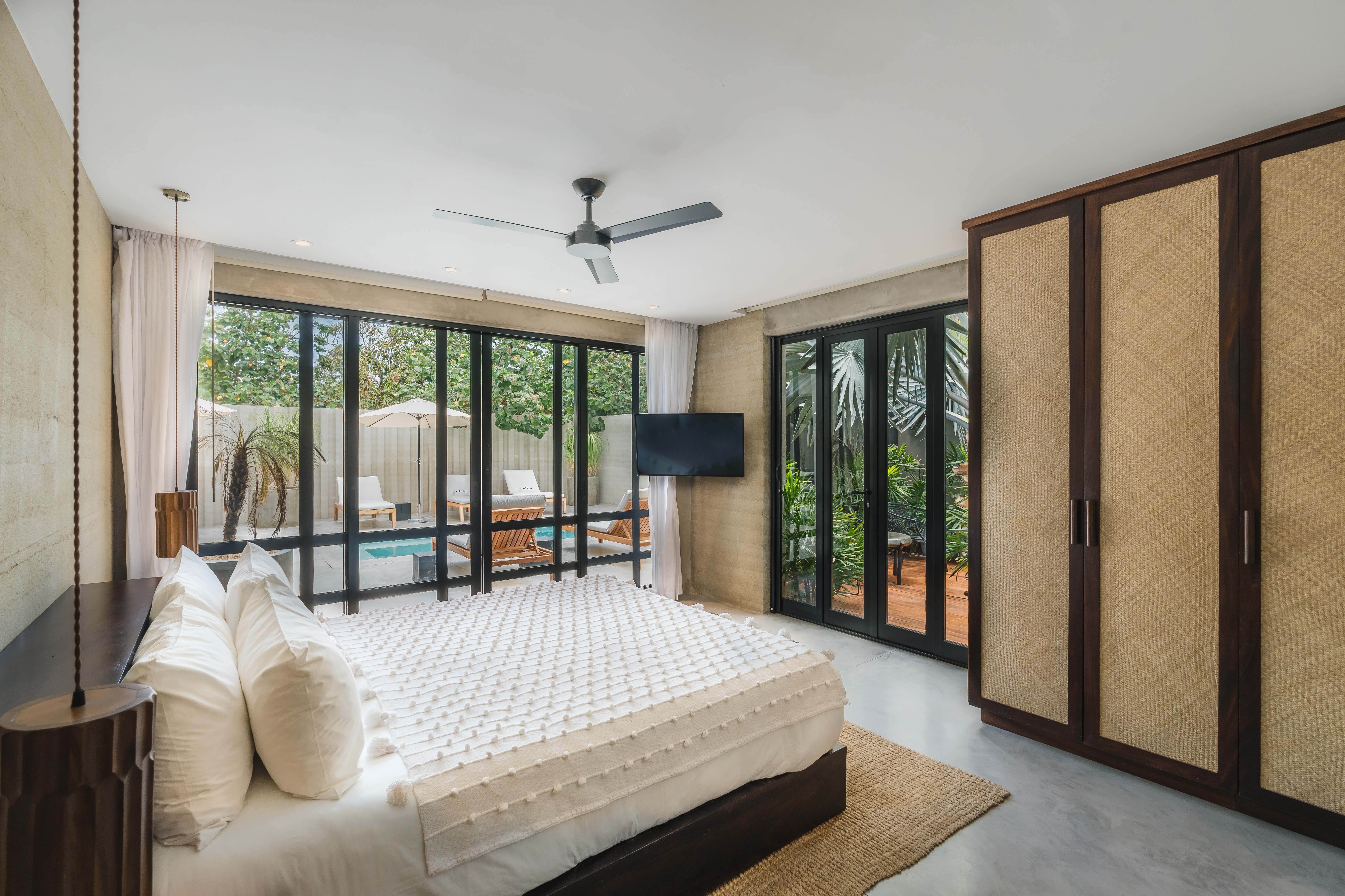 Designed by Fabrik G, this villa is a refined jungle hideaway created for privacy without isolation. Set quietly within Acre and just a short walk from the restaurant, it feels tucked away yet connected to the rhythm of the property. The open-concept layout flows seamlessly between indoors and out, with expansive pocket doors opening the kitchen and living space onto a plunge pool deck framed by lush greenery.