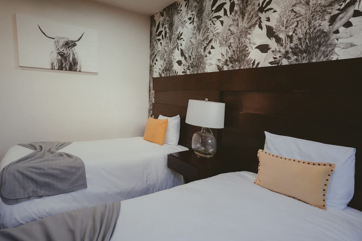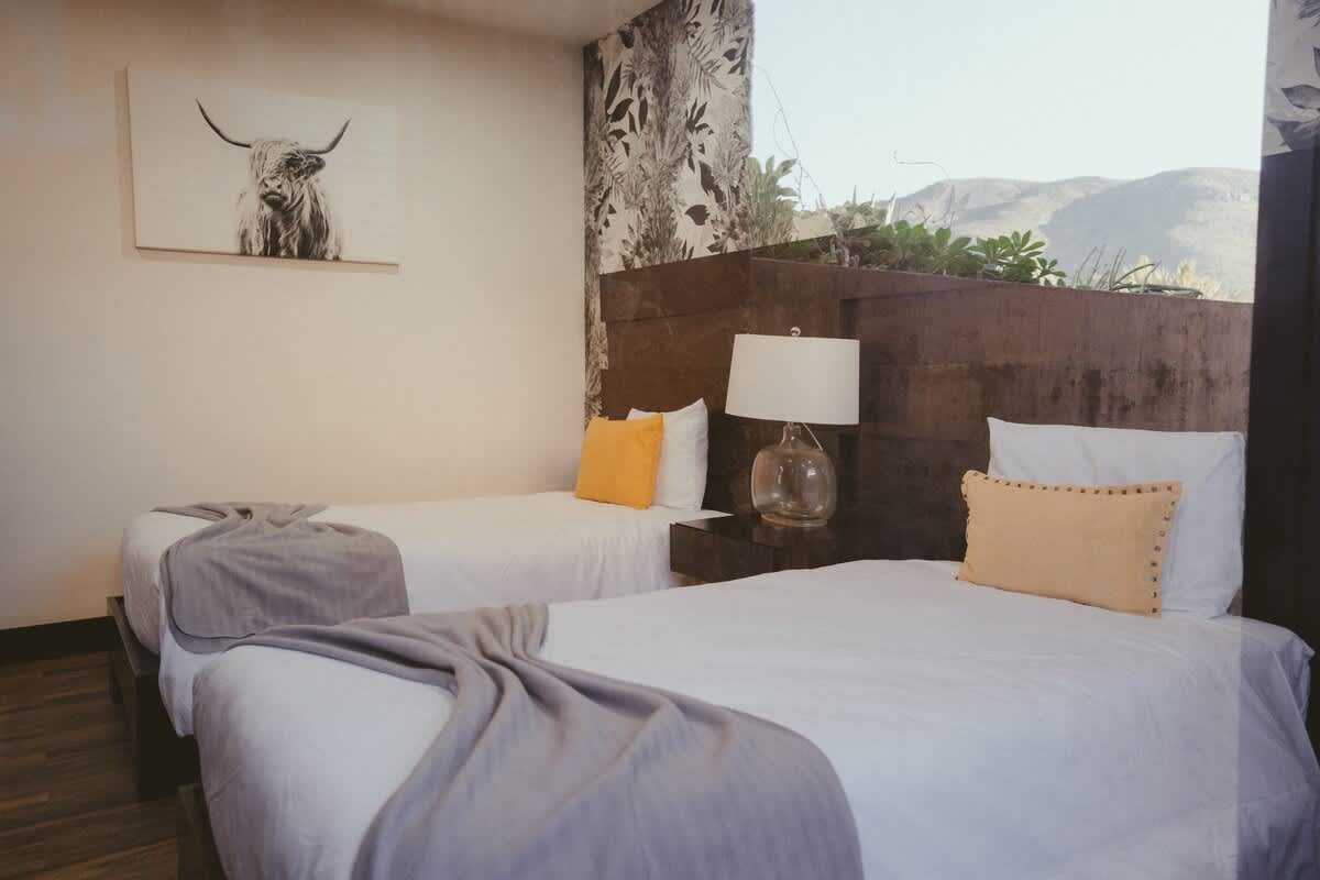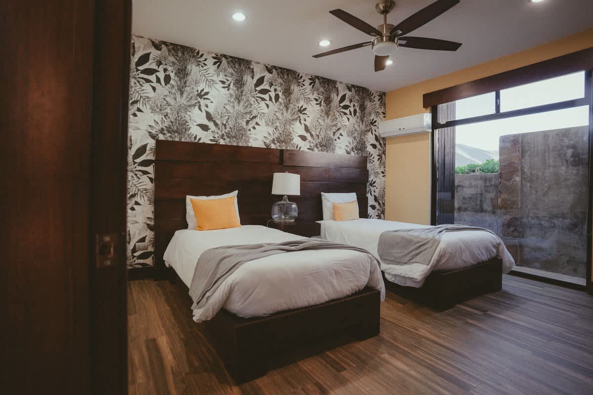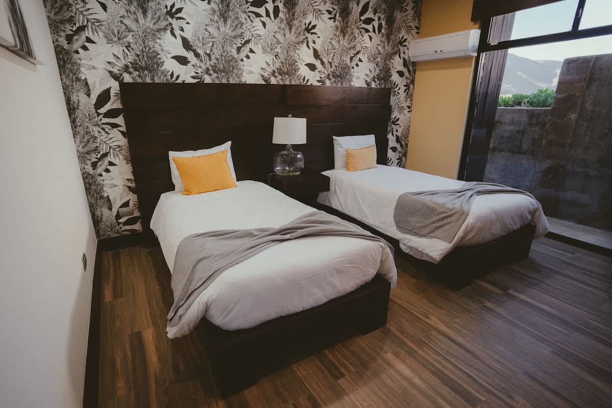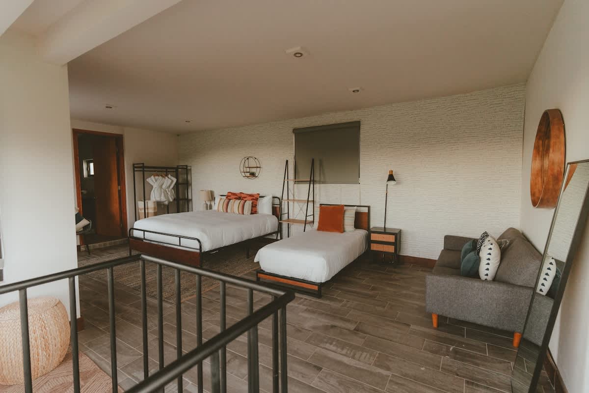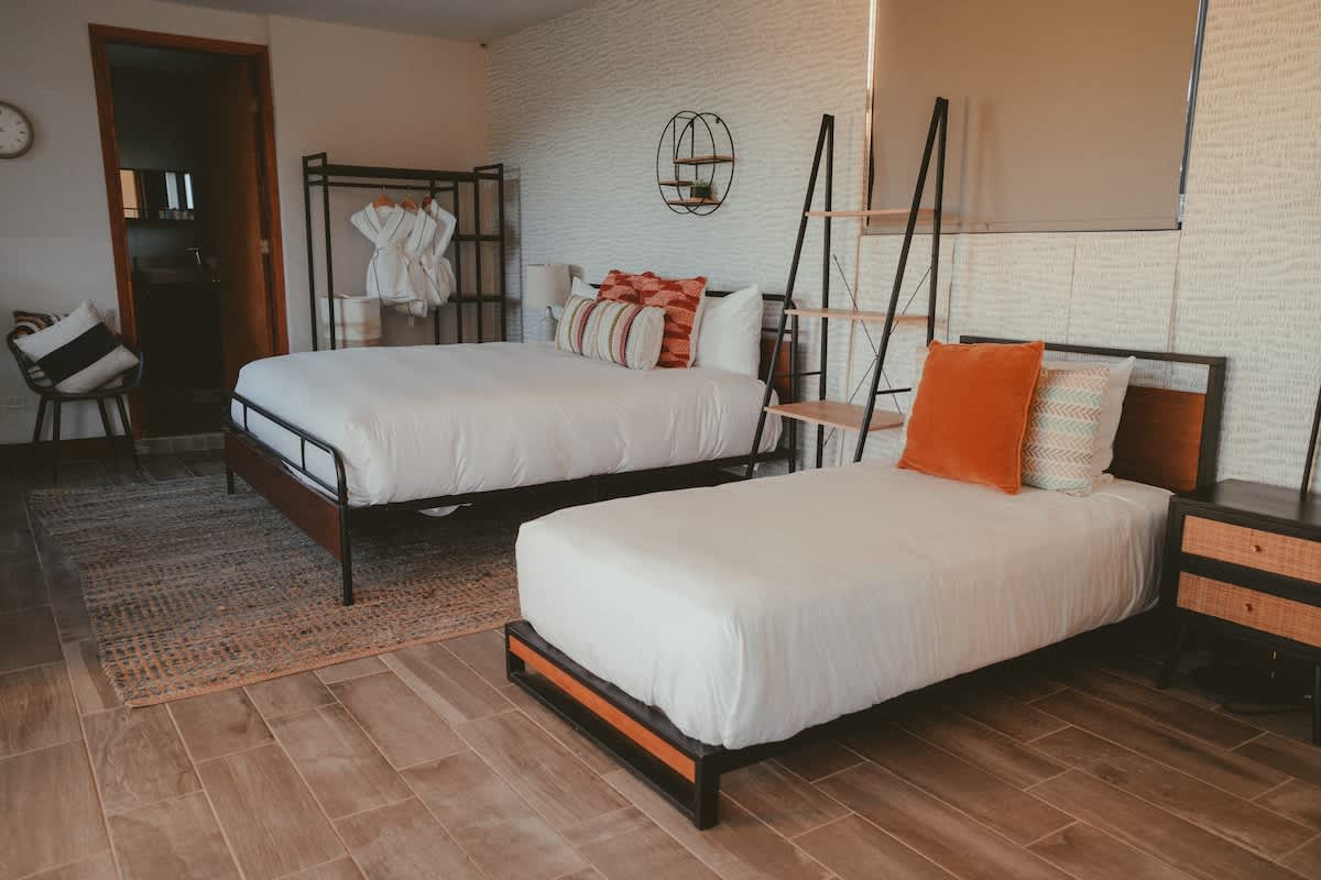The main house features three bedrooms: one with a king bed, one with a queen bed, and one with two twin beds. Just a few steps away is the second casita, designed as a spacious suite with one king bed and two twin beds all within the same open room.